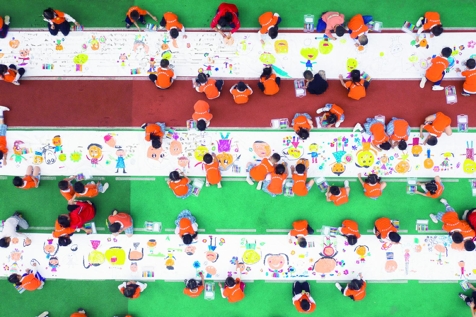 5月26日,重庆市北碚区实验幼儿园的孩子们在长卷上绘画(无人机照片)。