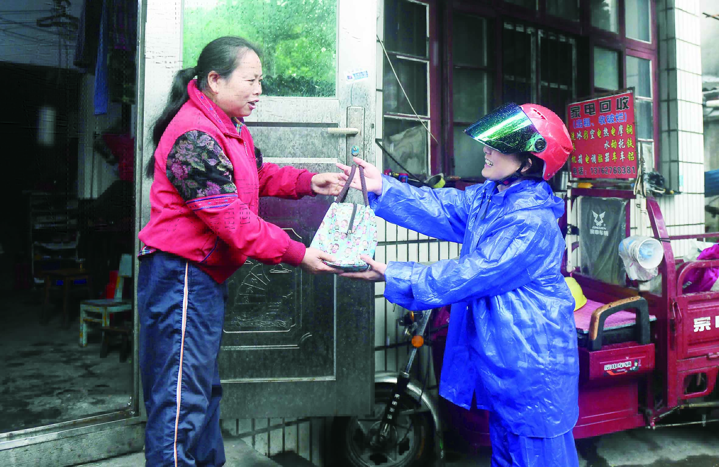 ▲城管信息采集员言芳从王红保手里接过午餐。 记者 谢慧 摄