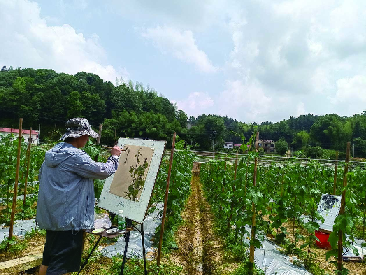 当日,艺术家们在丝瓜藤下泼墨描眉、挥毫点缀。在他们眼里,如诗如画的乡村美景、亦美亦香的白关丝瓜成了最好的创作源泉。