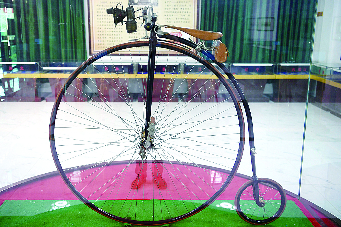 这是在甘肃三木自行车博物馆拍摄的1861年产自意大利的雄鹰大小轮自行车(6月2日摄)。 木头做的“走路机”、大小轮自行车、童年记忆里爸爸骑的二八大杠……6月3日是世界自行车日,记者日前探访甘肃三木自行车博物馆,这里珍藏了200多年以来,世界各国生产的古董自行车1300余辆。