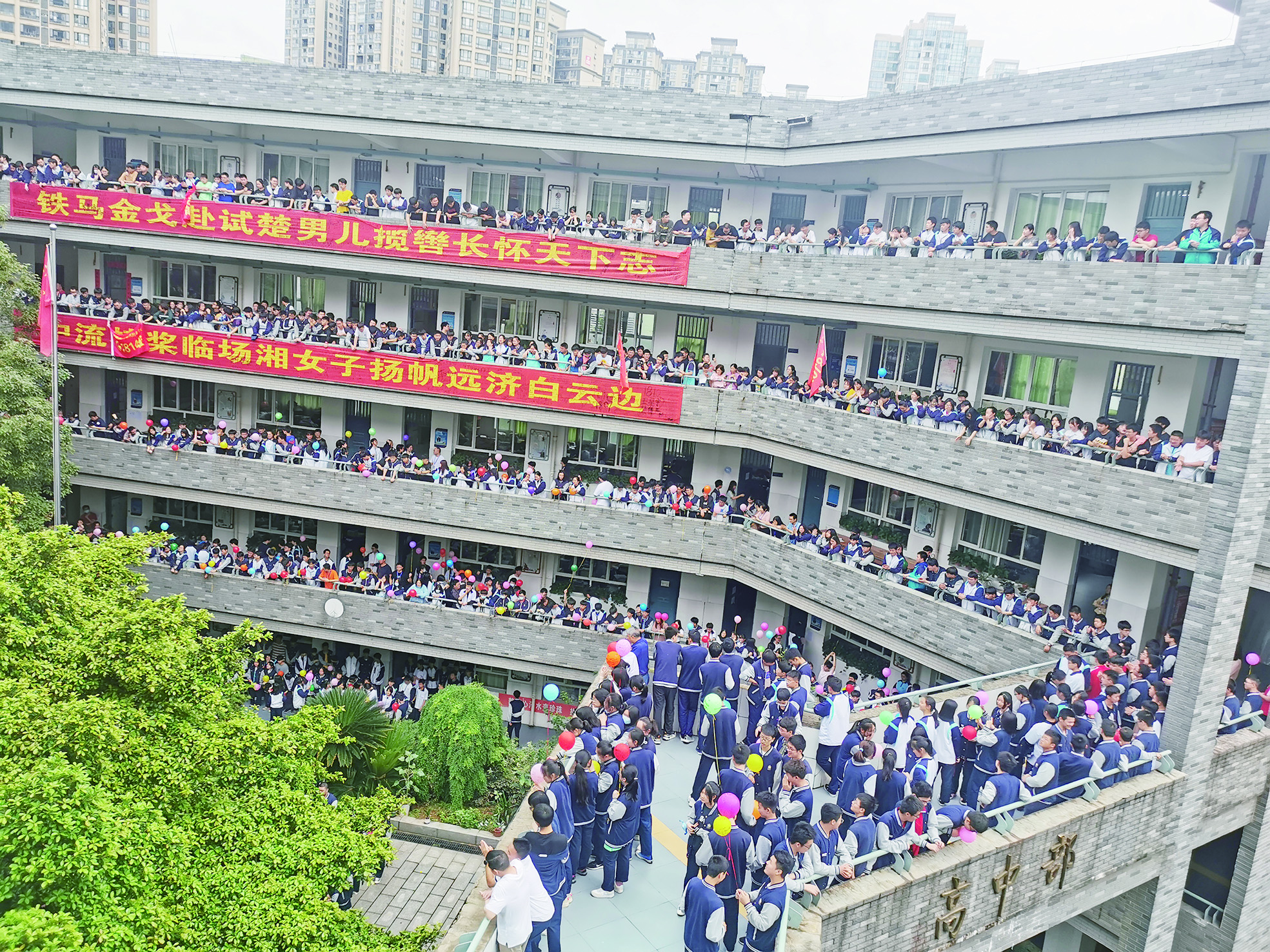 6月4日上午,北师大株洲附校高中部教学楼内人声鼎沸,近2000名高一高二学子齐聚,为即将奔赴考场的高三学长“喊楼”送祝福、加油助威。