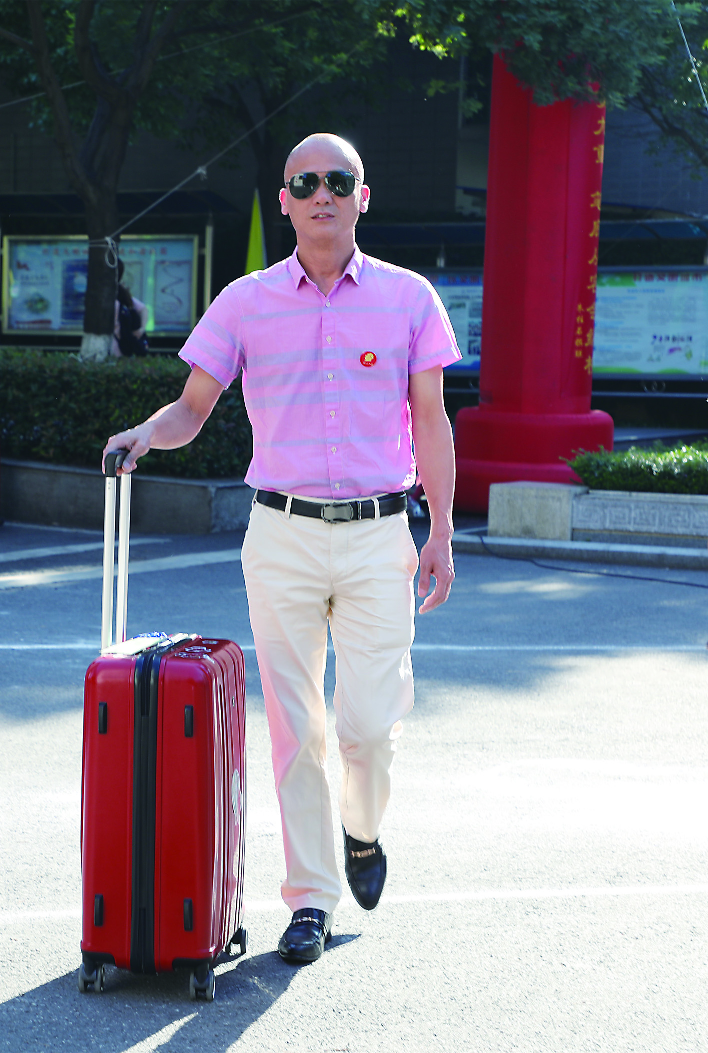 ◀王昭胜拉着红色大号行李箱送考,里面装有学生的准考证。 记者 谭筱 摄