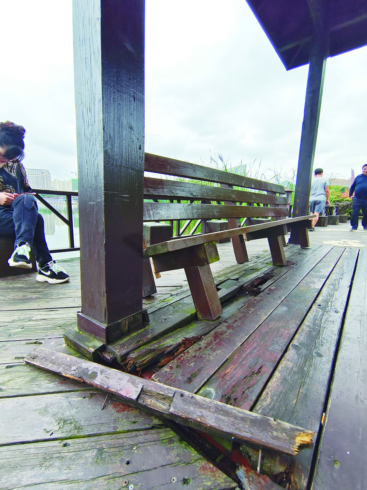 近日,市民在神农湖附近散步时,发现一处休憩亭里的木质长椅坏了。从外观看,长椅坏掉倾斜已有一段时间了,一些木头腐烂比较严重。因为此处长椅无法供人乘坐,几位游客只好坐在一旁的木墩子上休息。与此同时,一些铁钉裸露在外,存在安全隐患。