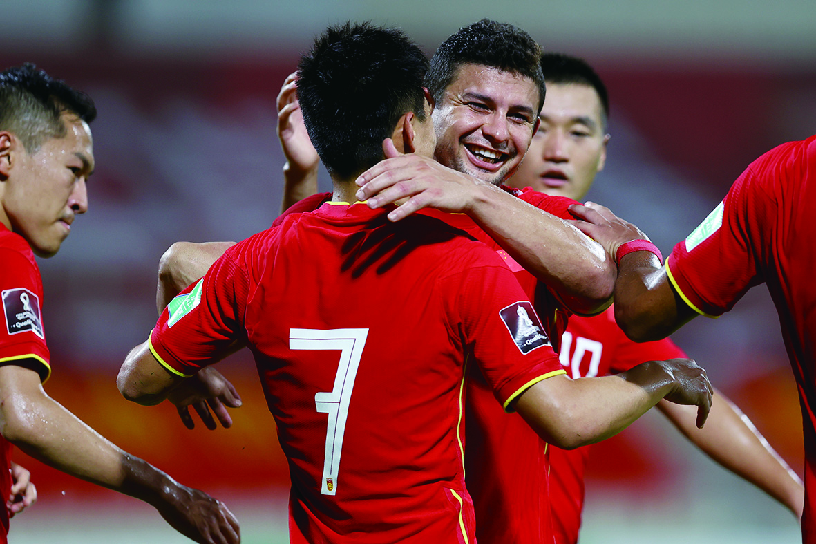6月7日,中国队球员武磊(左二)进球后与队友庆祝。 当日,在阿联酋沙迦举行的2022年卡塔尔世界杯预选赛亚洲区40强赛中,中国队以2比0战胜菲律宾队。