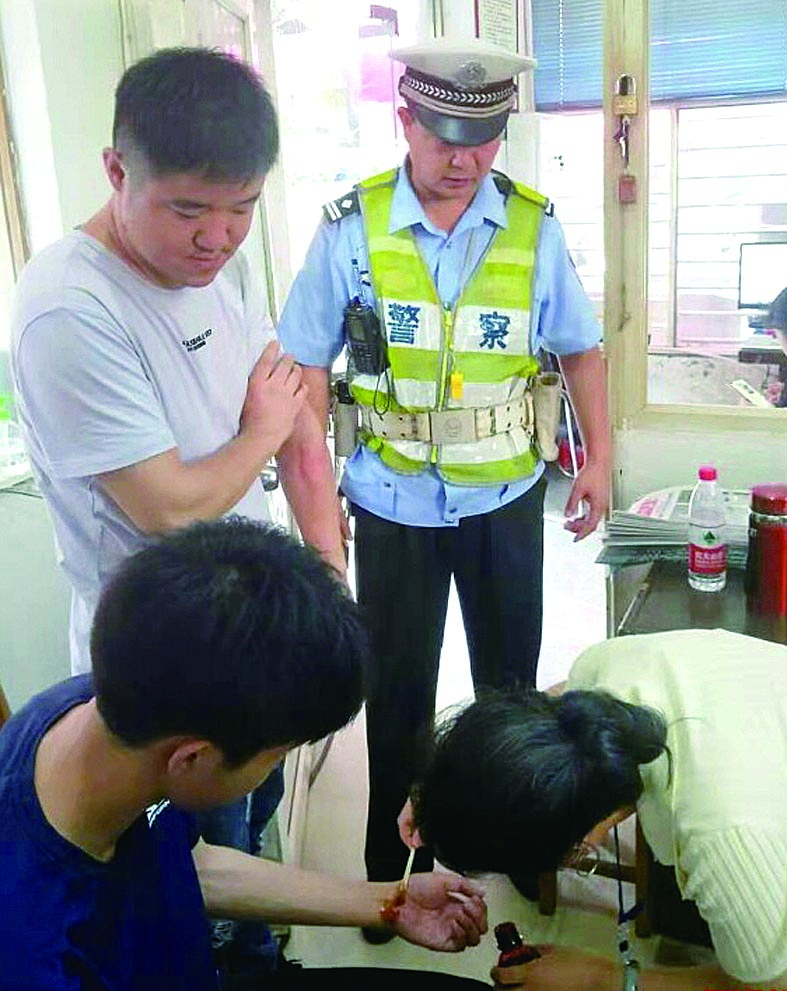 ▲交警将受伤考生送到卫生室处理伤口。 通讯员供图