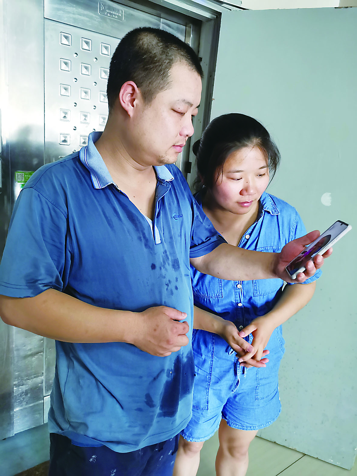 ▲在病房外,李艳和丈夫吴宇翔翻看有关女儿的视频。 记者 刘琼 摄