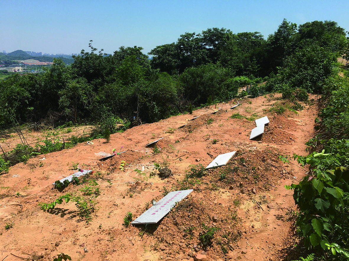 空旷地呈梯田状,植被被清除,堆有数十个土丘,部分土丘上放有还未竖立的石质墓碑。在空旷地旁,分布有硬化的坟墓。现场有两名男子在对一座坟进行硬化。