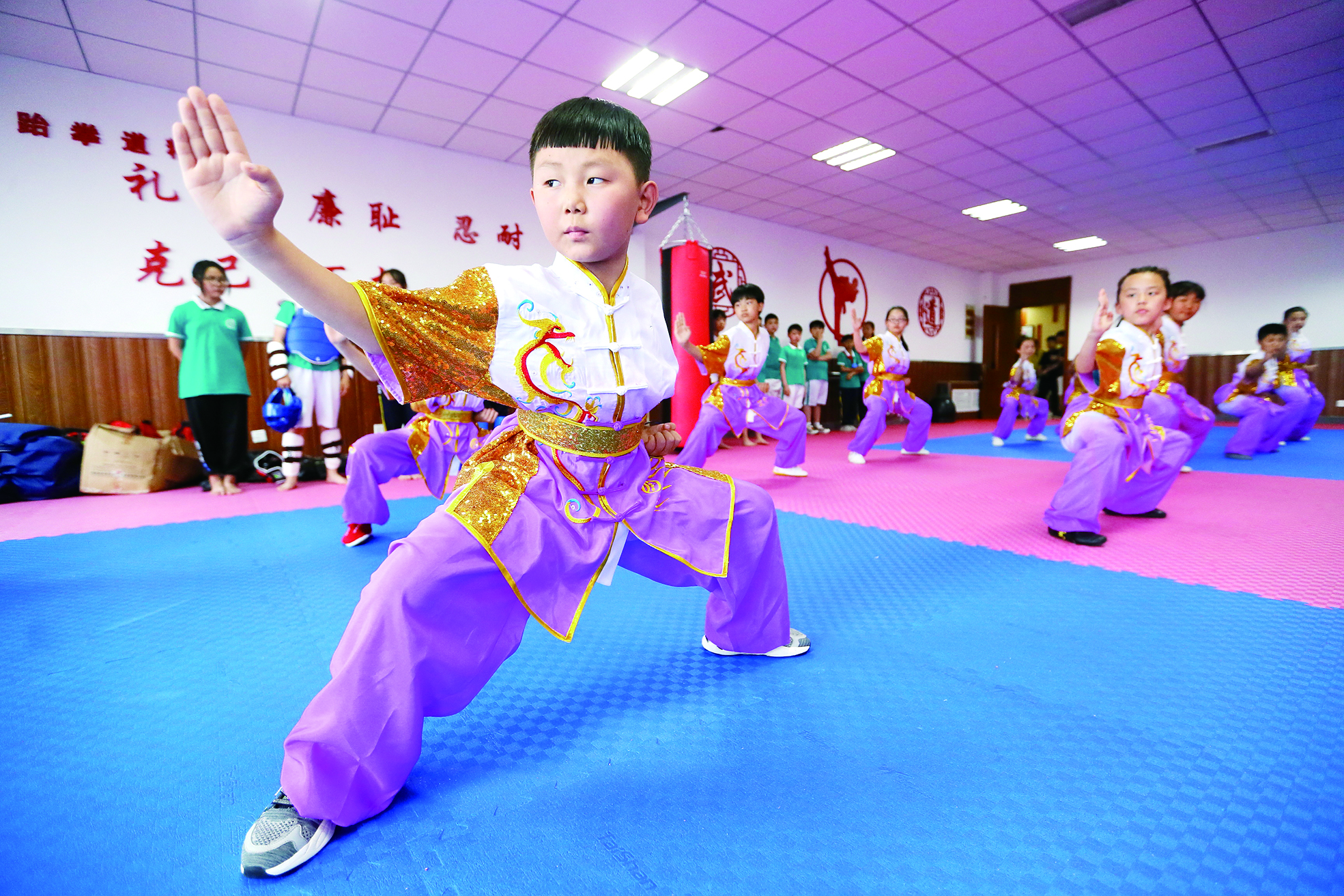 6月10日,山东省青岛通济实验学校的学生在大课间学习武术操。
