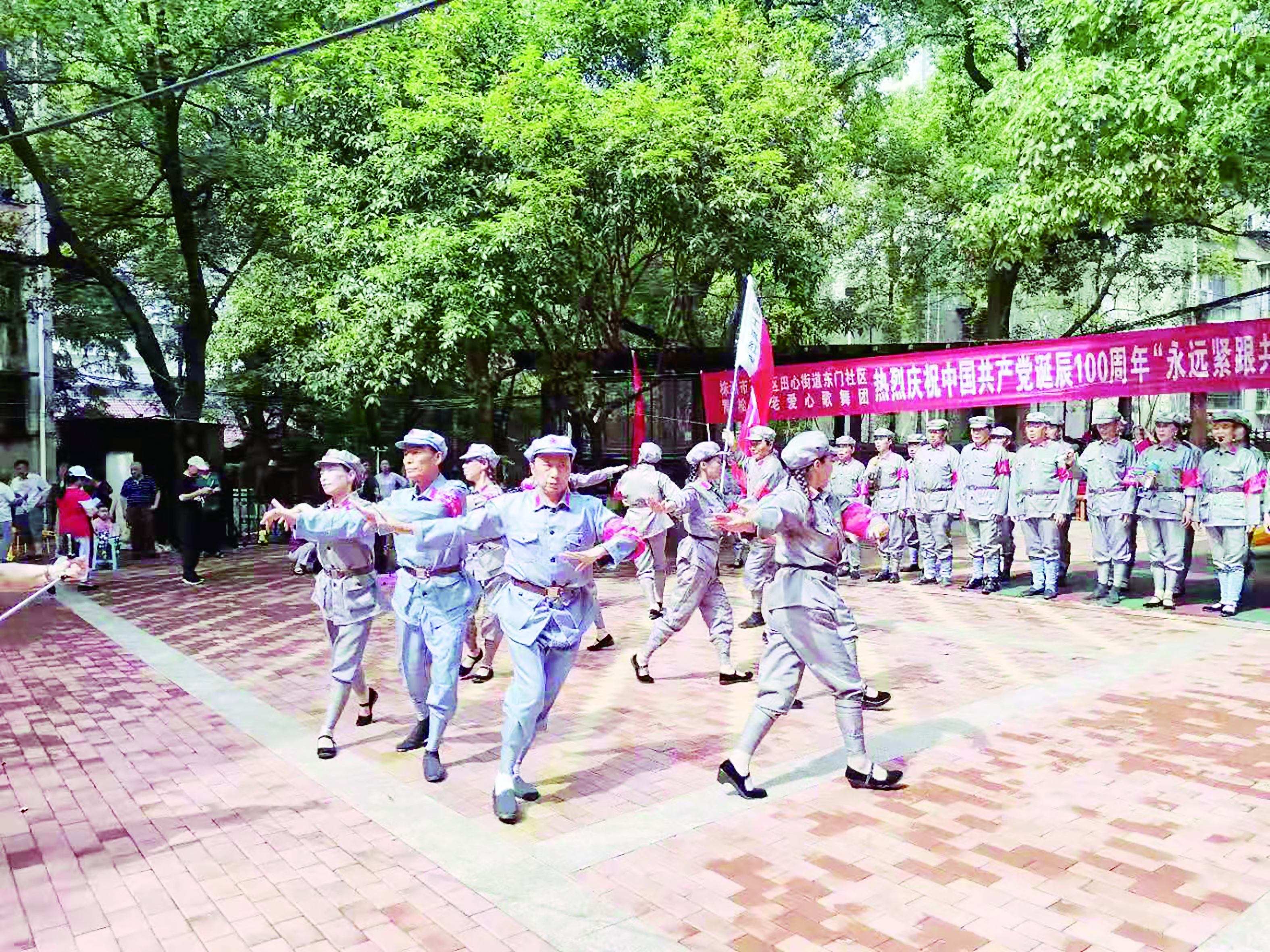 ▲6月12日,石峰区青松不老爱心歌舞团在石峰区紫腾小区,举行庆祝建党百年文艺演出,《红船向未来》大合唱、歌伴舞《过雪山草地》、齐唱《义勇军进行曲》……节目精彩纷呈,吸引了众多居民观看。大家都说,这是一堂生动的党史教育和爱国主义教育课。图为歌舞团演出现场。