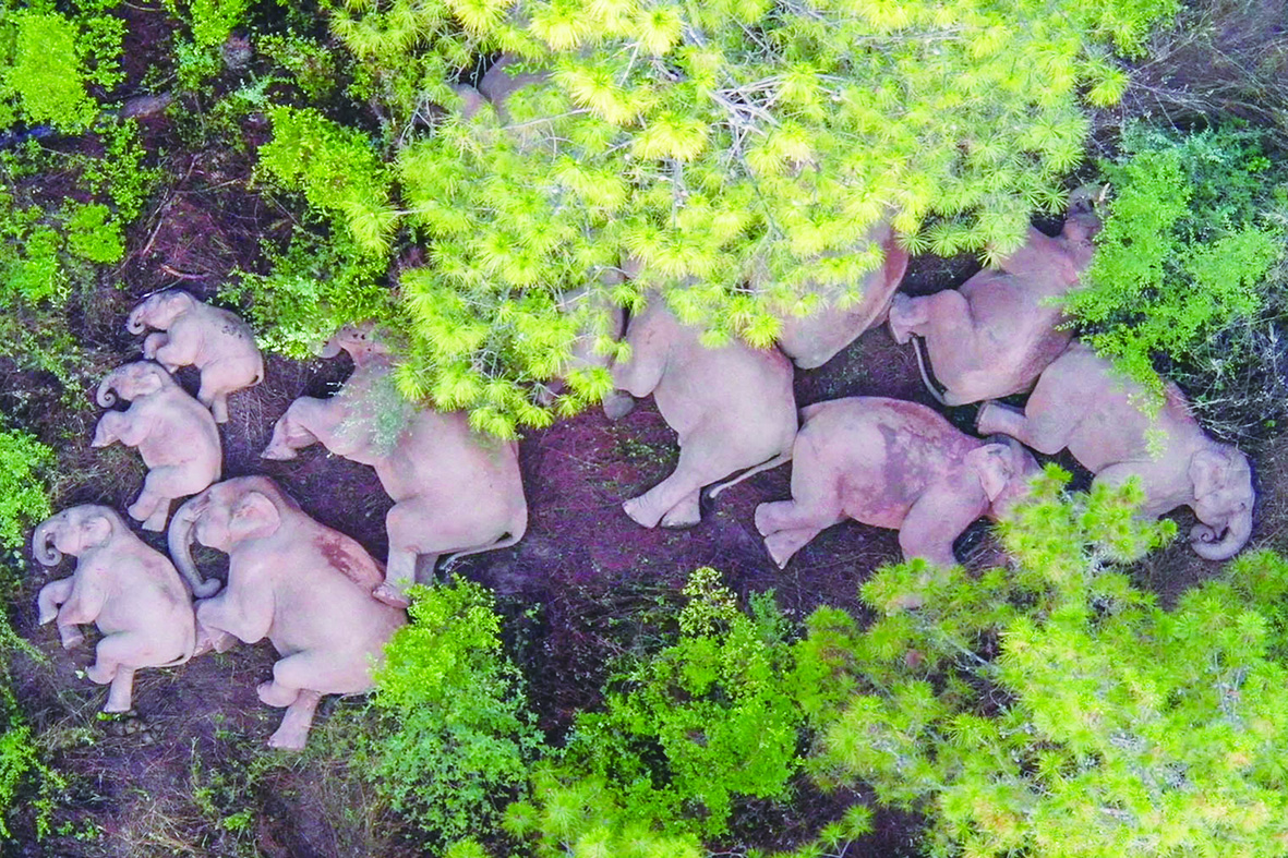 这是6月13日在云南省玉溪市易门县十街乡拍摄的象群(无人机照片)。 当日,记者从云南北迁亚洲象群安全防范工作易门县现场指挥部了解到,云南将尝试利用降雨、降温等有利条件,通过科学、适量投食引导,疏堵相结合的方法,帮助北迁亚洲象逐渐返回适宜栖息地。 此外,云南已对北迁亚洲象沿途造成的群众经济财产损失启动野生动物肇事公众责任保险定损赔付工作,待统计定损工作完成,将对沿线居民损失进行赔付。