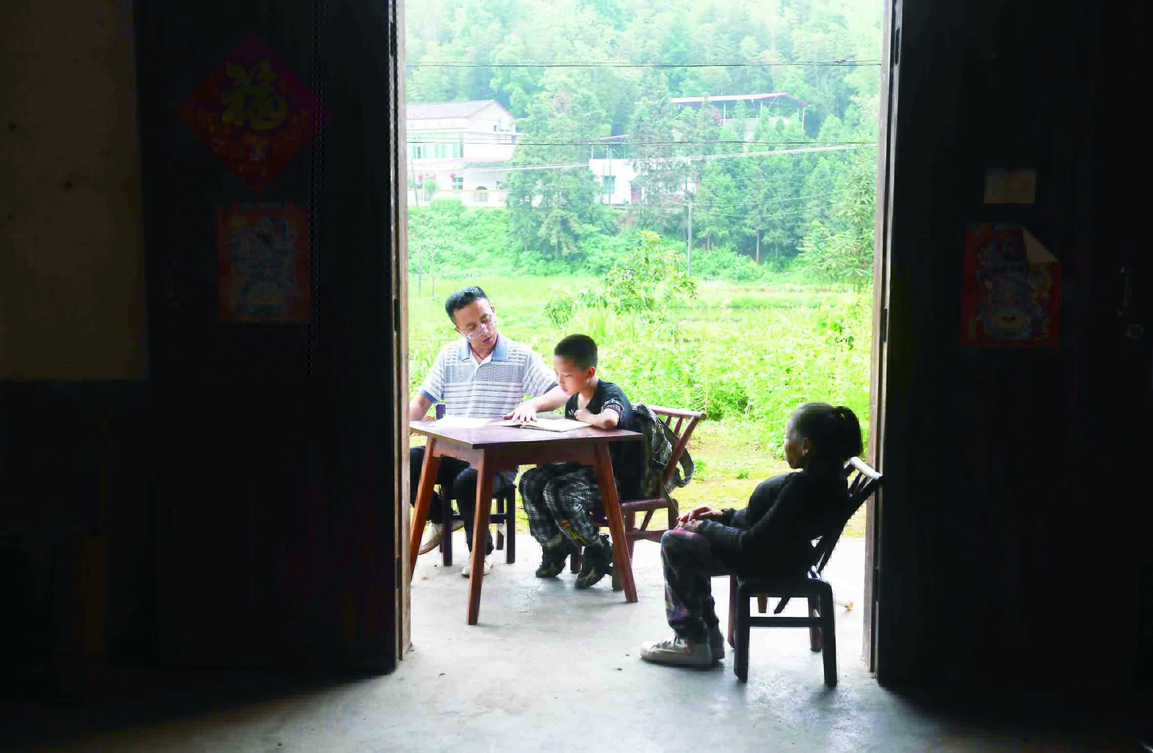 ▲文运良辅导侄子写作业,姐姐便在一旁认真地看着。