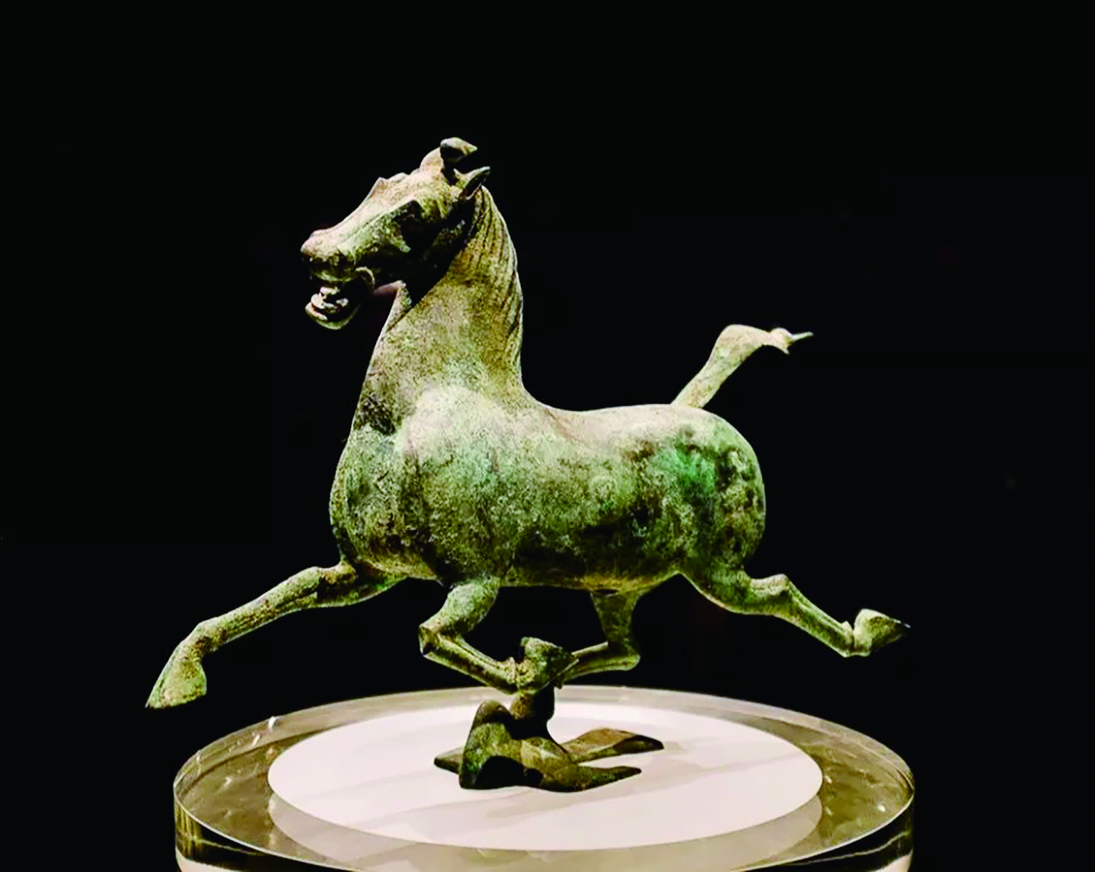 这匹高仅34.5厘米,长45厘米,宽13厘米的铜马,重量有7.15公斤,而飞马脚下的龙雀却巧妙成了整件雕塑的支点。整体上看,“铜奔马”是汉代人勇武豪迈的气概、昂扬向上的精神面貌的表现,反映了汉王朝的强大与富足。