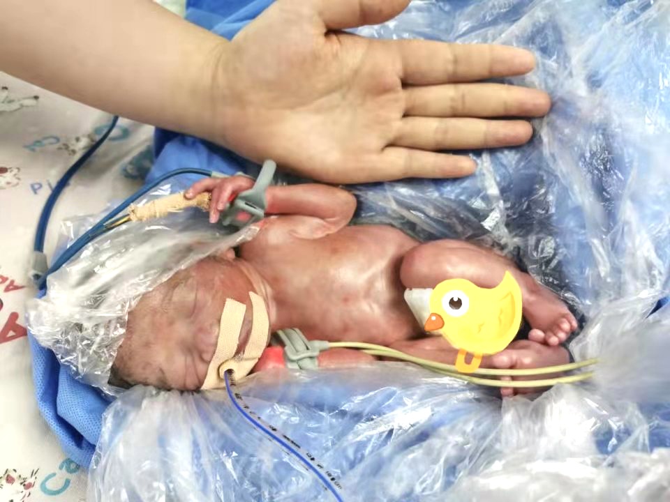 当晚9时22分,在产科医生的帮助下,“小二”提前降生了。让人感到揪心的是,仅有750克的“小二”属于极低出生体重儿,各个器官尤其是肺部发育极度不成熟,出现呼吸窘迫综合征,全身青紫。