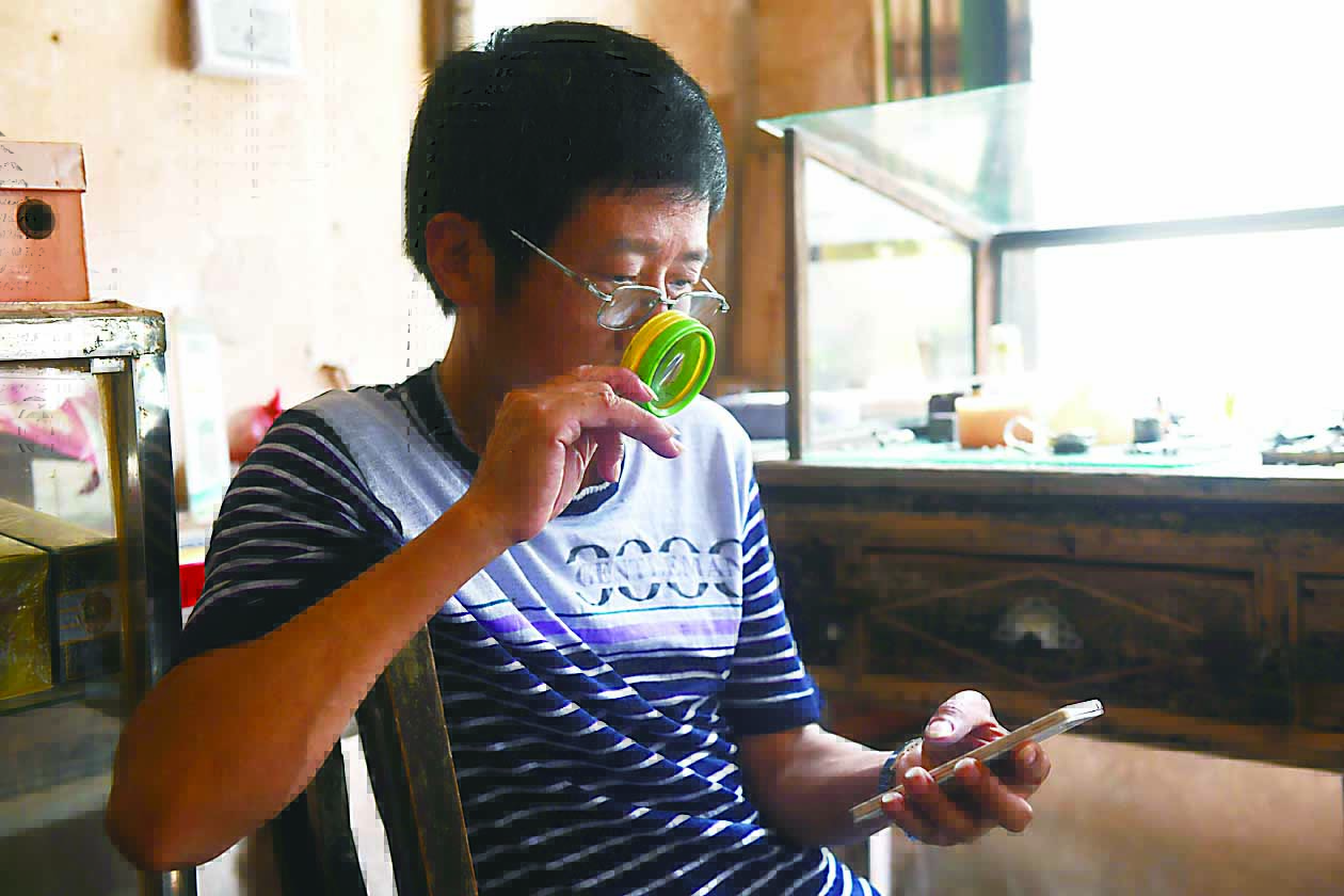 ▲长年修表对眼睛造成了损坏,他看手机需要借助放大镜。