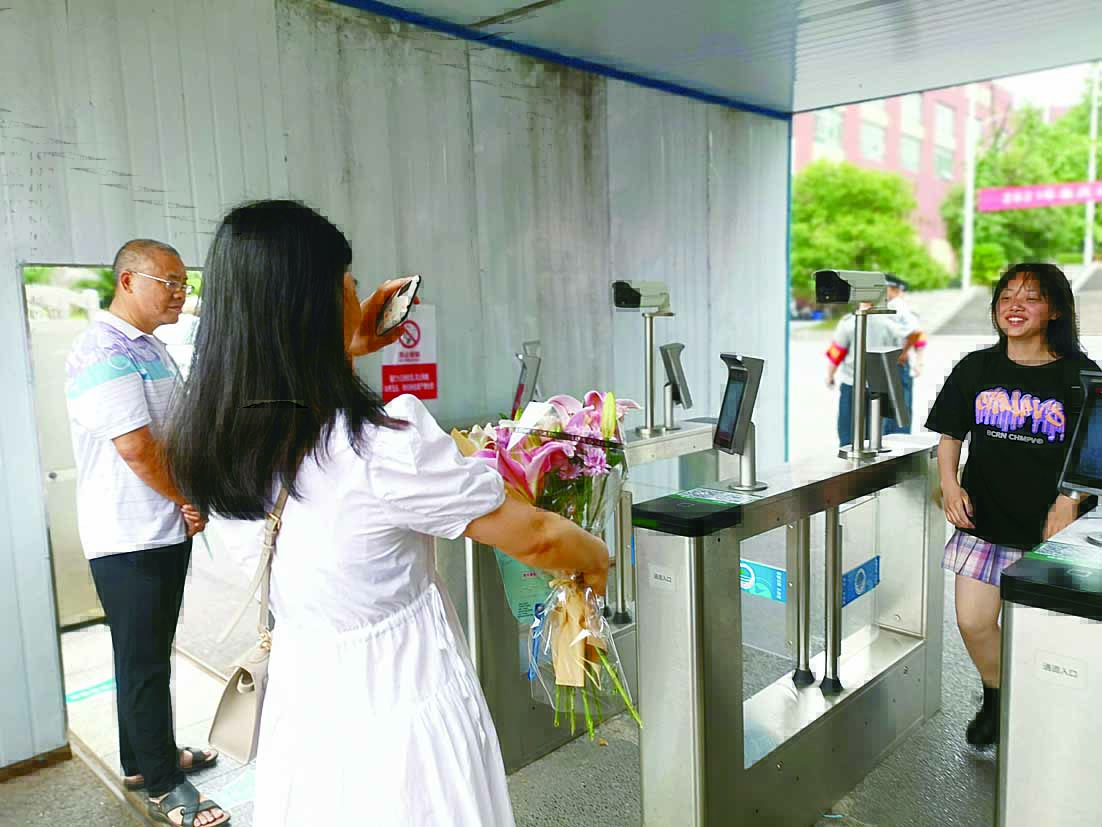 ▶考生亲友送上鲜花。 记者 戴凛 摄