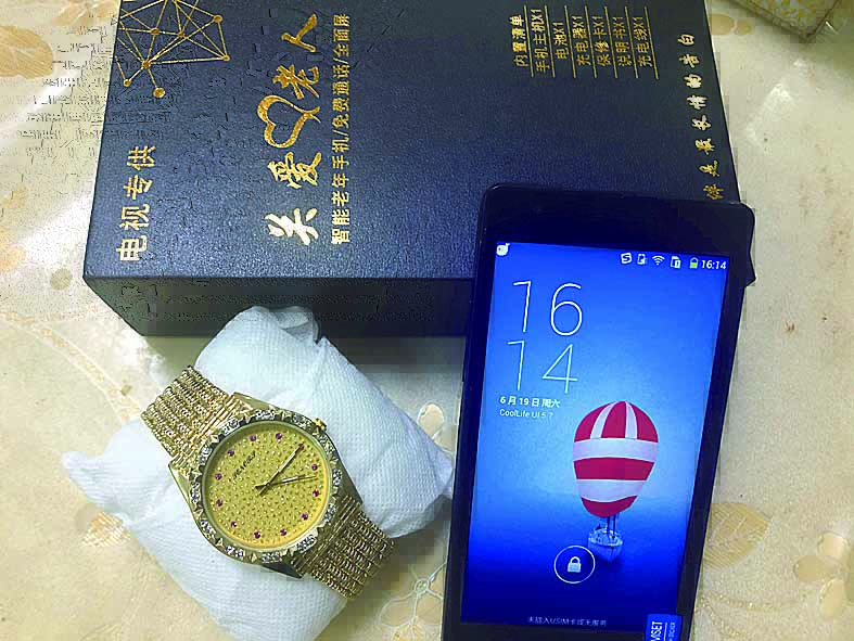 ▲曾爹爹买到的“智能手机”和赠送的“名表”。 记者 易楚曈 摄