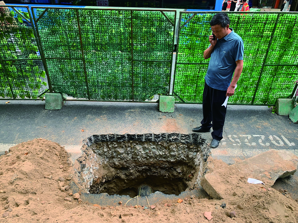 ▲6月22日上午,人民路一处燃气管网改造开挖点黄土裸露 ,现场人员表示将于次日晚开始施工。记者 吴楚 摄