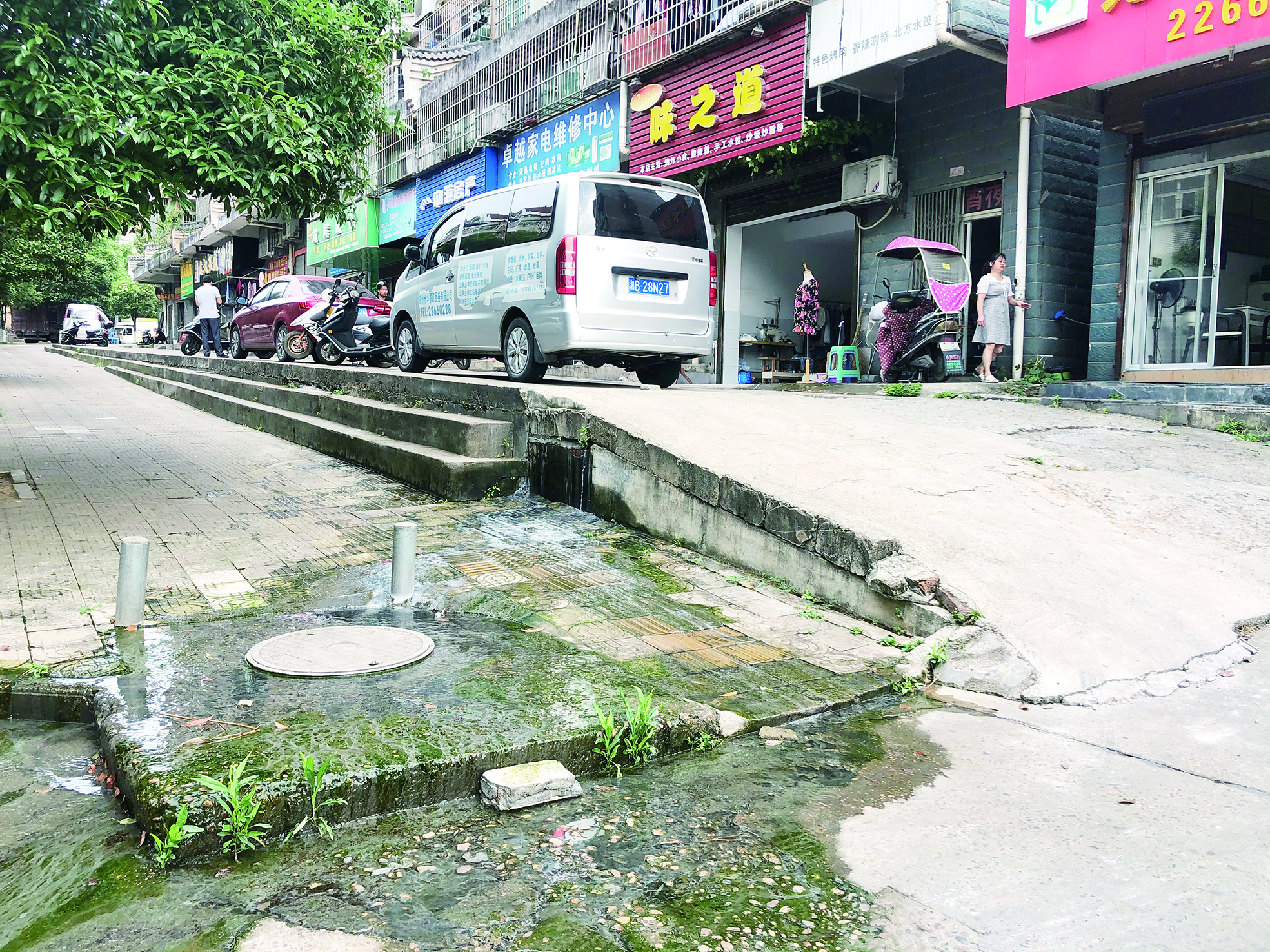 ▲天台小区污水直排人行道路面。 记者 易楚曈 摄