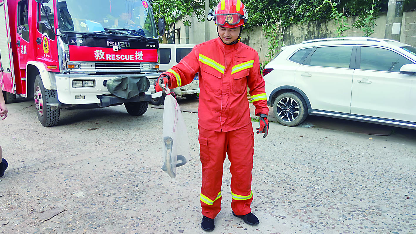 响石岭消防站消防员到达现场后发现,一条约2米长的眼镜蛇正蜷缩在居民楼角落里,消防员眼疾手快利用捕蛇器夹住蛇的头部,眼镜蛇发出“呲呲呲”的声响,身体缠绕在捕蛇器的杆子上,消防员徒手果断抓住蛇的“七寸”部位,放入捕蛇袋中,后交由林业部门处理。