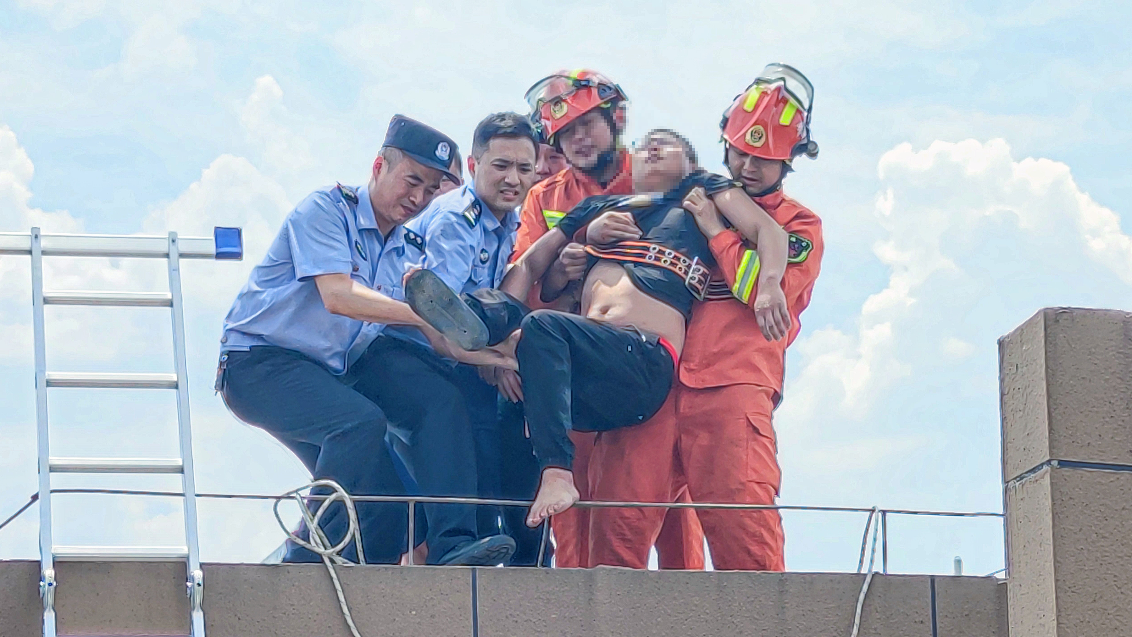 夏堃随后联系到男子的父母,并叫到现场与其沟通,分散其注意力。然而,轻生男子见到父母到场后,突然情绪激动起来。千钧一发之际,民警和消防人员一个箭步冲上去,拽住男子的手,将其拖离危险区域。