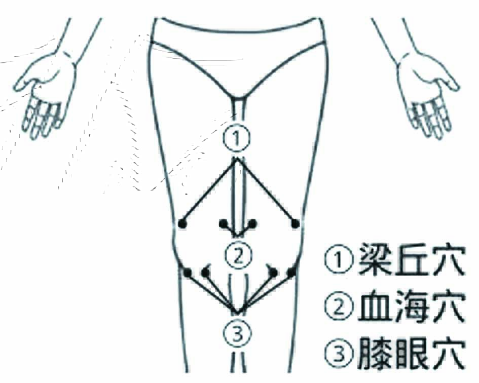 按摩梁丘穴。该穴有疏肝和胃、通经活络的作用。刺激梁丘穴可采用推按的方式,用指腹推按穴位3分钟。
