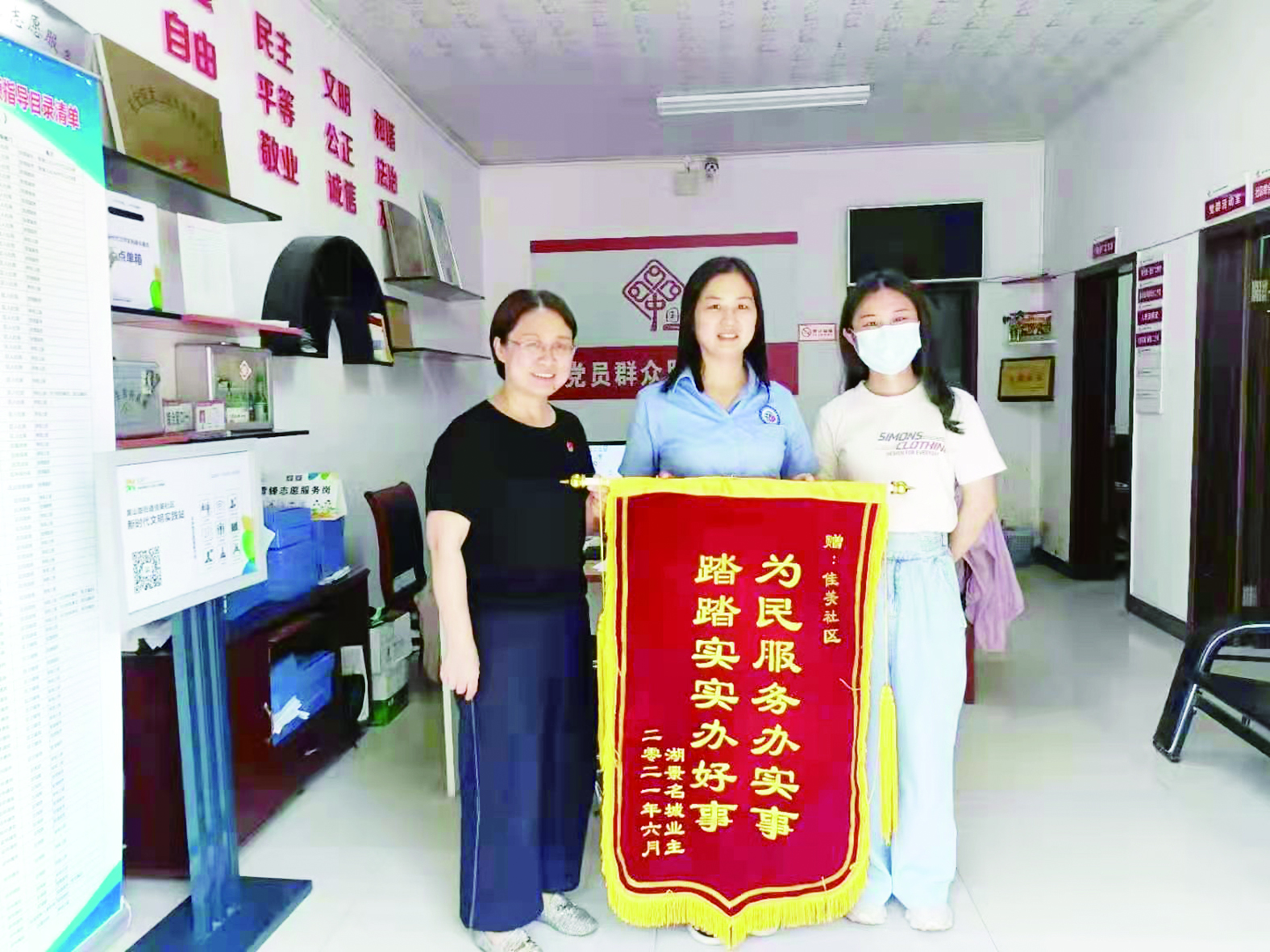 本报讯(株洲晚报融媒体记者/周圆 通讯员/马杰)“要不是社区网格员小张,我家的漏水问题到现在还解决不了呢,真的太感谢你们了。”6月24日下午,家住天元区湖景名城小区的李女士来到佳美社区居委会,给网格员张灵芝送上一面锦旗表示感谢,锦旗上写着“为民服务办实事 踏踏实实办好事”几个大字。