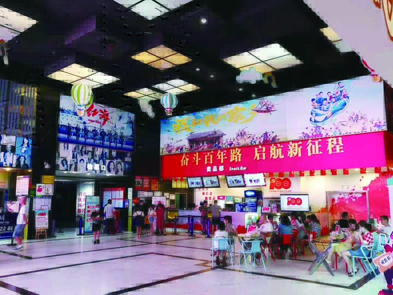 入夜,位于神农城三楼的中影国际影城热闹了起来。整个影院很“红”,庆祝中国共产党成立100周年的标识随处可见,不少市民佩戴党徽、手持党旗前来观影。