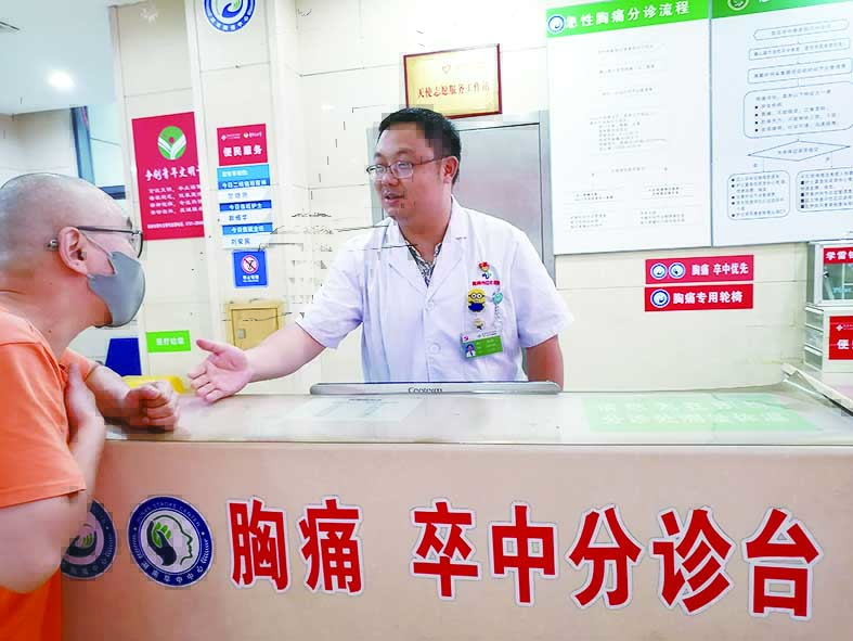 晚上10时,市中心医院急诊大厅灯火通明,急诊科男护士易进华正在预检分诊台忙碌着。