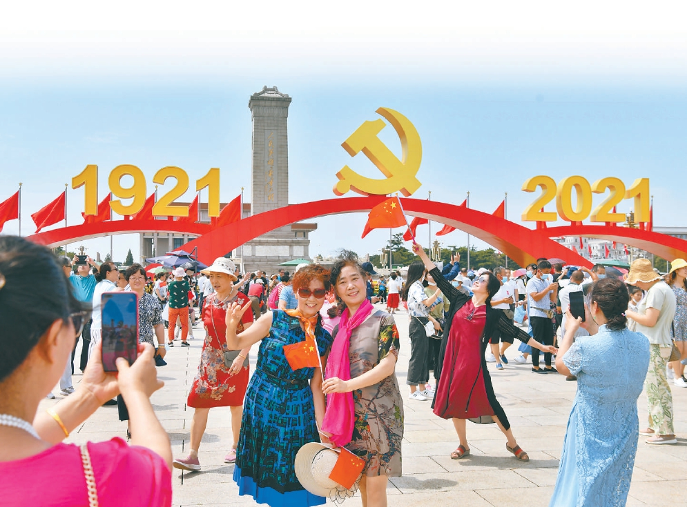 ▲昨日是天安门广场建党百年庆祝大会景观向公众开放参观的首日。上午,在天安门广场,不少市民游客在景观前摘下口罩,打卡留影,整个上午进入广场参观游客数超6.5万人。据悉,天安门广场保留的庆祝盛典景观将开放至7月15日。 (据人民网、北京晚报)