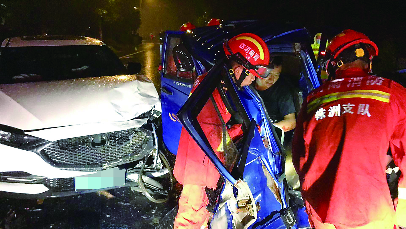 7月1日凌晨3时许,醴陵消防救援大队接到报警称,在醴陵106国道滴水井路段,一辆三轮车与小车相撞,驾驶员受伤被困驾驶室。接警后,阳三石消防救援站消防员迅速赶赴现场处置。