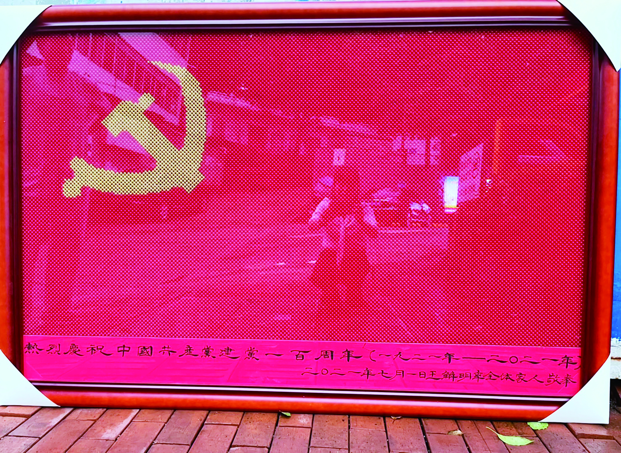 ▲用串珠制作的党旗被装裱起来。 记者/戴凛 摄