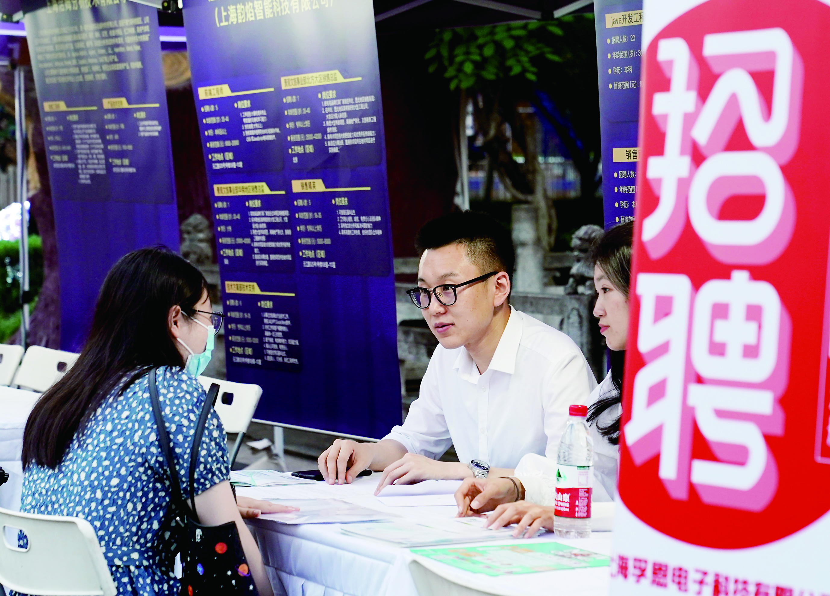 ▲6月21日,求职者和招聘人员在上海某招聘活动现场交流。 新华社记者/刘颖 摄