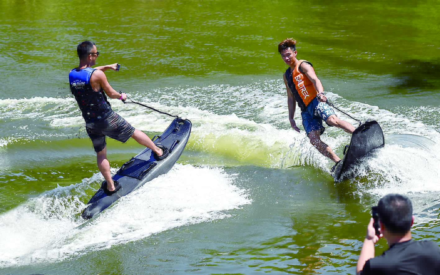 7月8日,在云龙示范区云田镇菖塘水库,小疆新材料(株洲)有限责任公司技术人员正在测试动力冲浪板第二代碳纤维复合材料产品性能。