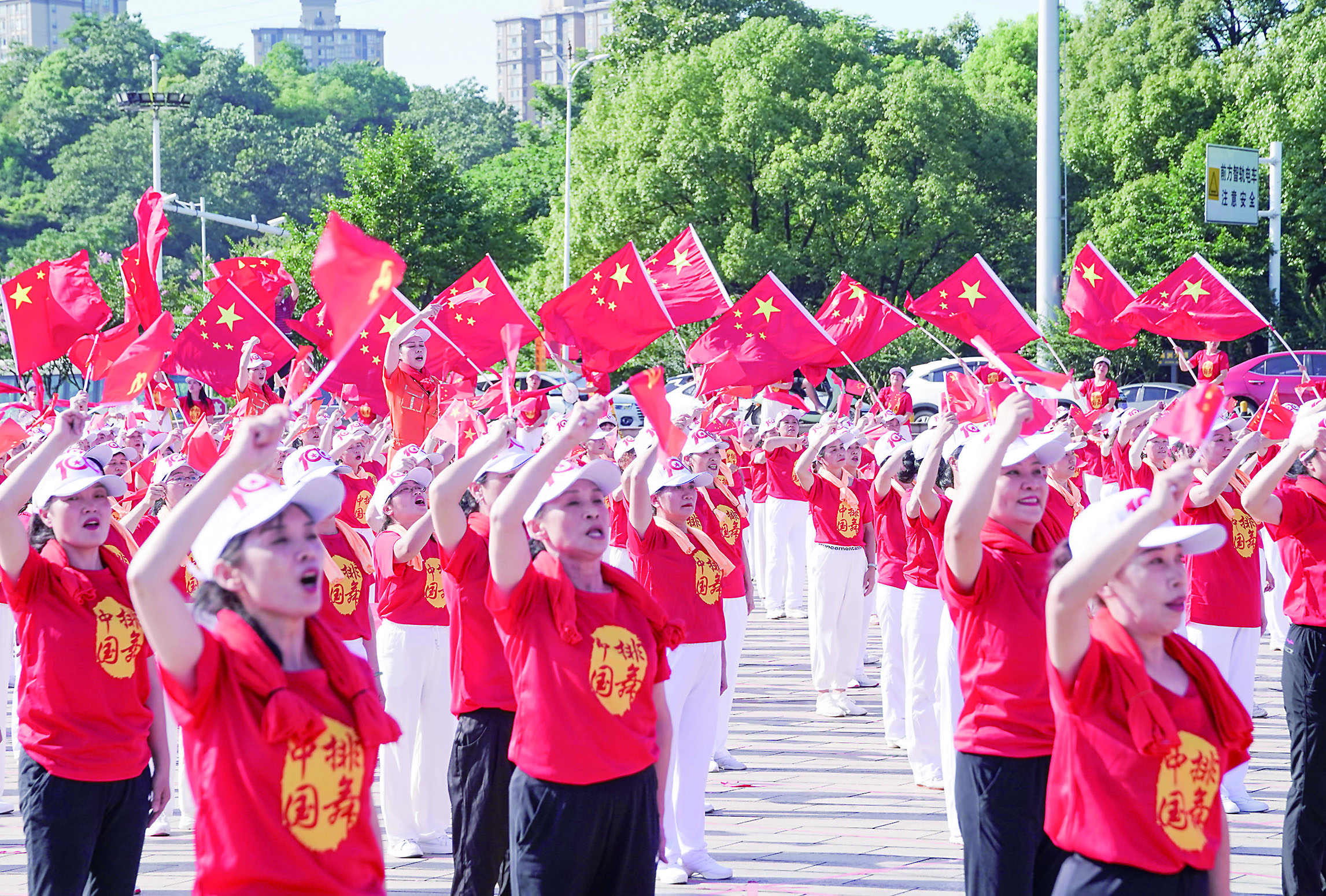 7月10日,激昂的红歌声中,国旗飞舞,在市体育中心火炬广场,“庆祝中国共产党成立100周年——舞动株洲”排舞展演活动举行。来自全市的排舞、广场舞爱好者近两千人迎歌起舞,展现出株洲市民昂扬向上、朝气蓬勃的精神风貌。