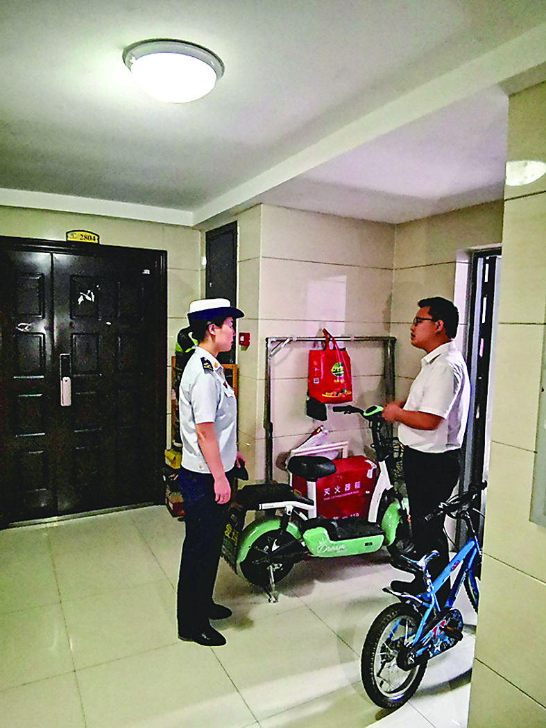 ▲消防部门工作人员现场检查电动自行车“上楼入户”情况。 市消防支队供图