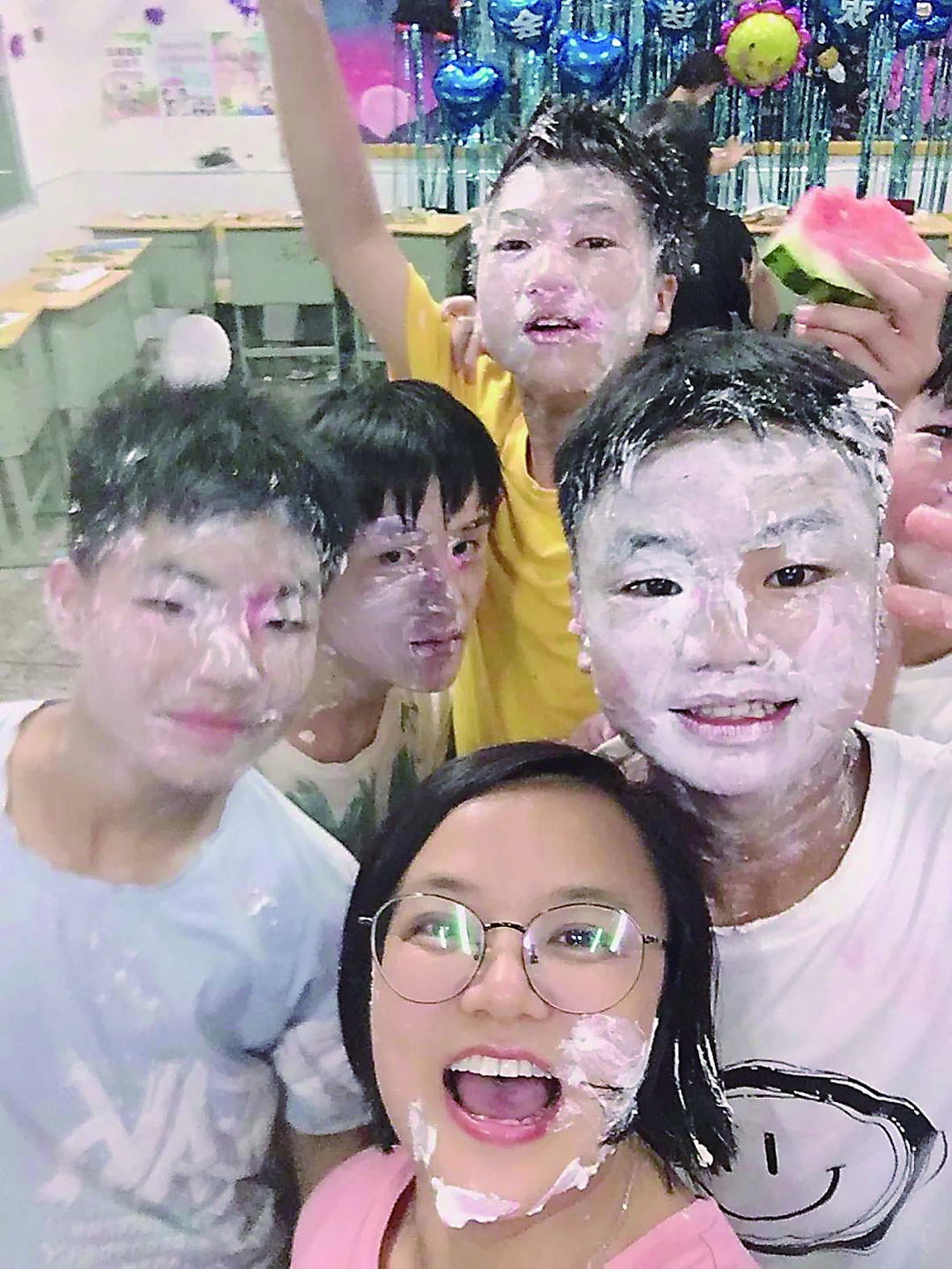 ▲离别前,同学们和傅老师打起了“蛋糕战”。 受访者供图