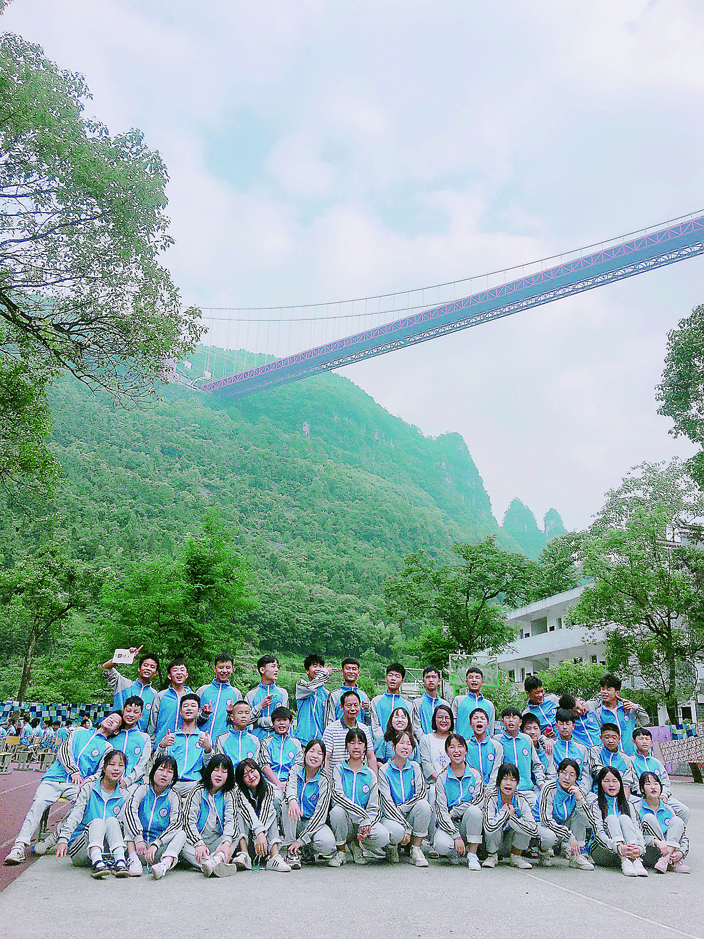 矮寨中学在哪里?充满疑惑的傅琼和到达学校后,猛一抬头就看到,操场上方竟是就是雄伟壮丽的矮寨大桥,而她,就站在著名的5A级风景区德夯大峡谷里。傅琼和说,“惊艳,惊喜,惊叫,心花怒放,溢于言表。”