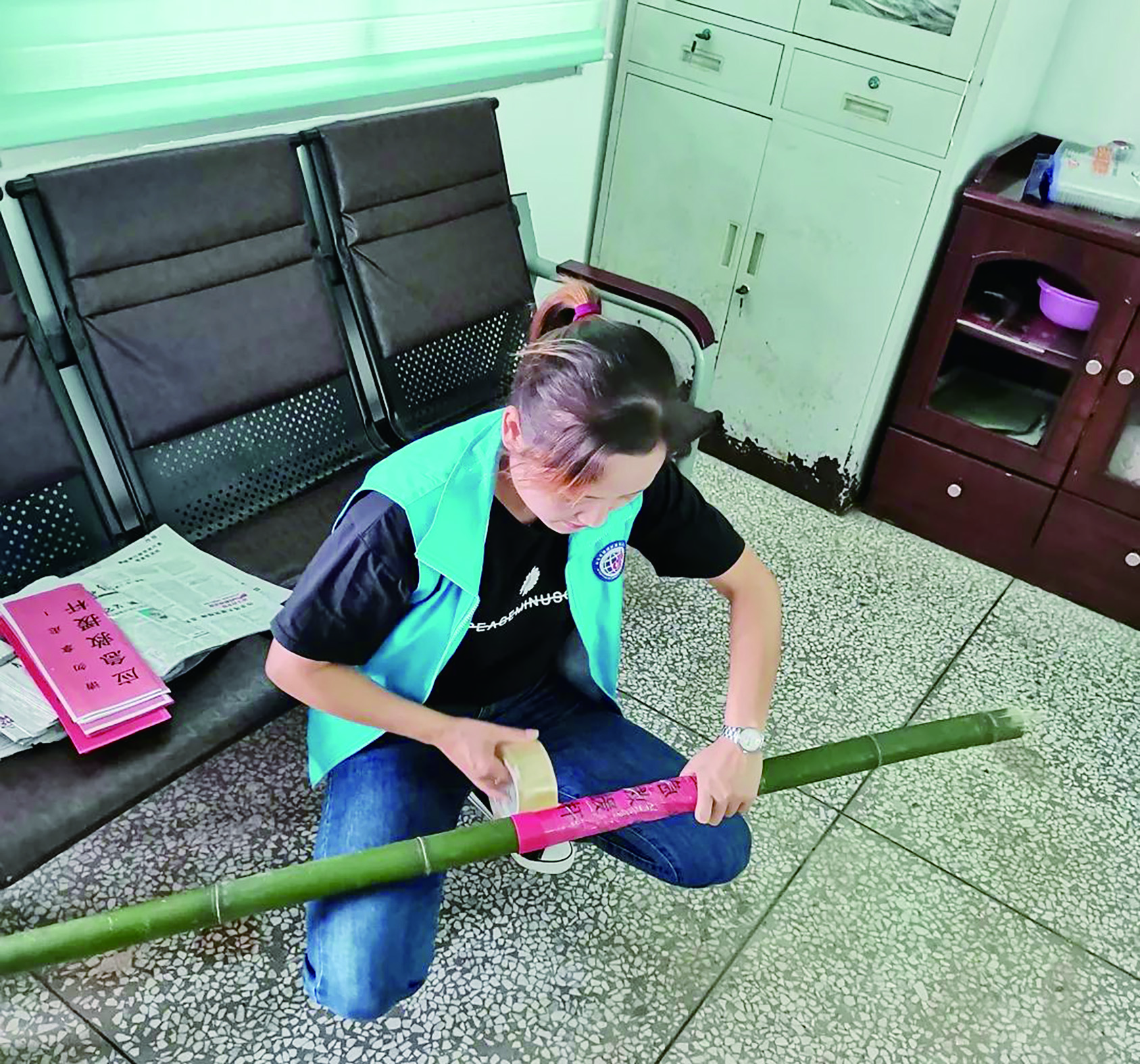湖坪村的全科网格员们纷纷响应,自己动手,上山砍下粗细合适的竹子,截成长度合适的竿子,用胶带和红色A4纸在竹竿上标注好“紧急救援竿”“请勿挪动”等字样,放置在村里山塘水池边醒目位置。