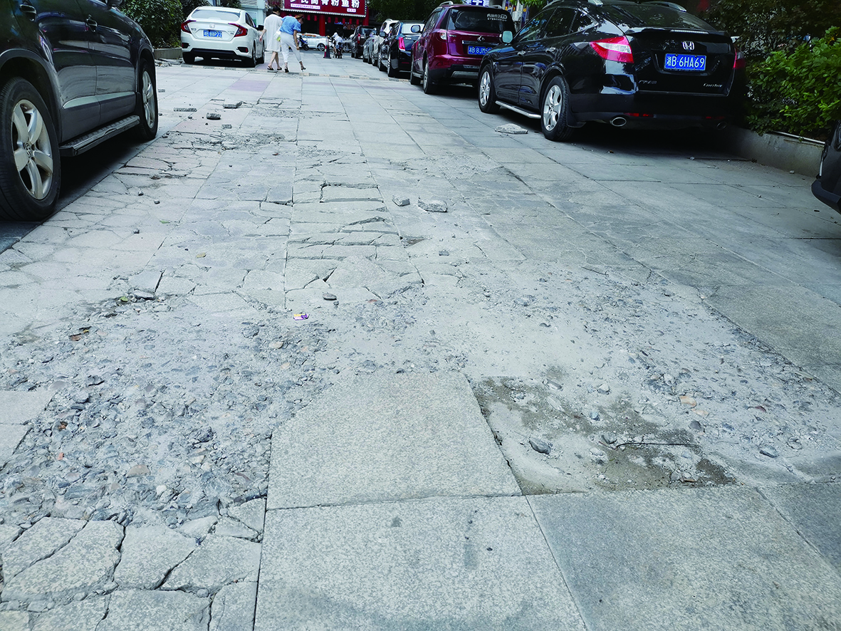 ▼石子湖公园仁爱医院旁停车场地砖破烂不堪。 记者/姚时美 摄