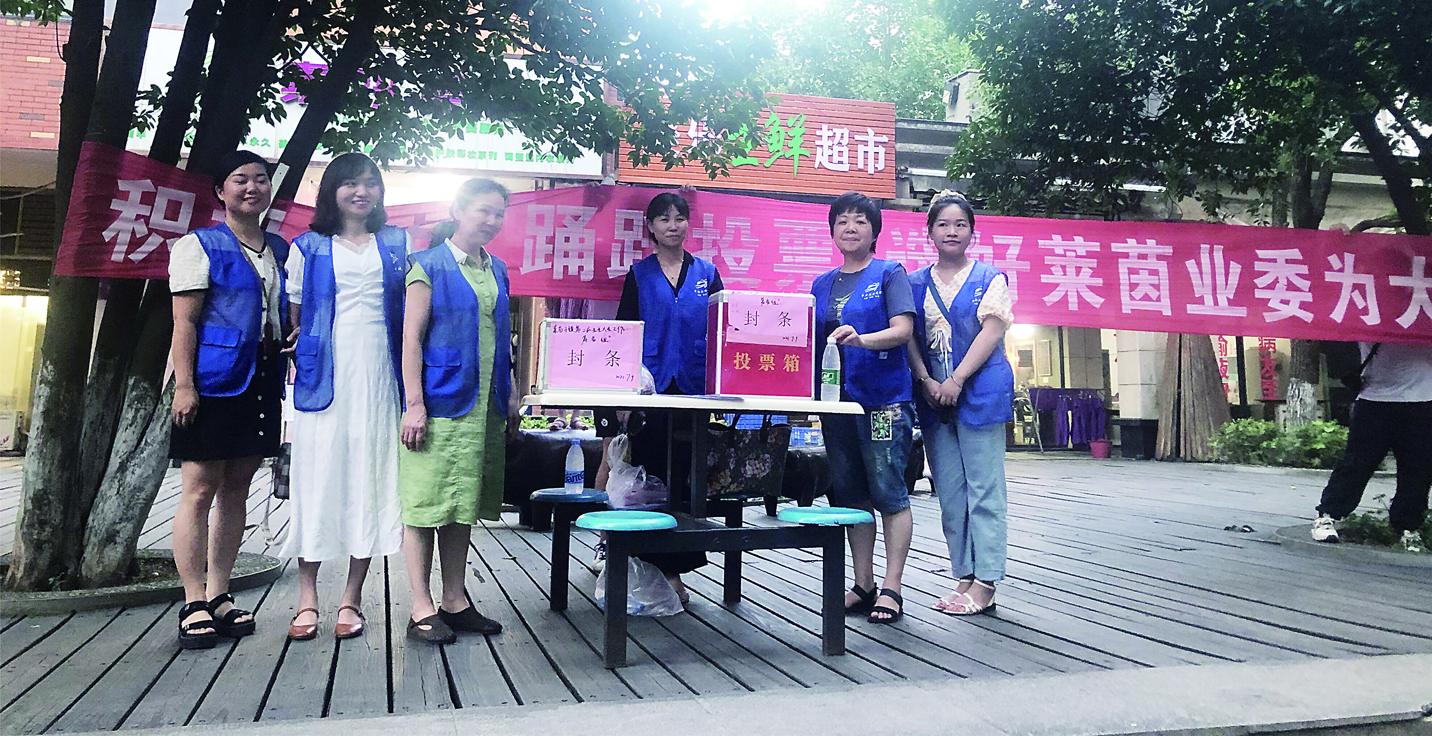 7月14日下午6点,莱茵小镇广场一侧,网格员陈文湘与同事们拉起横幅摆开桌椅,耐心地为小区居民讲解业委会选举的相关政策。