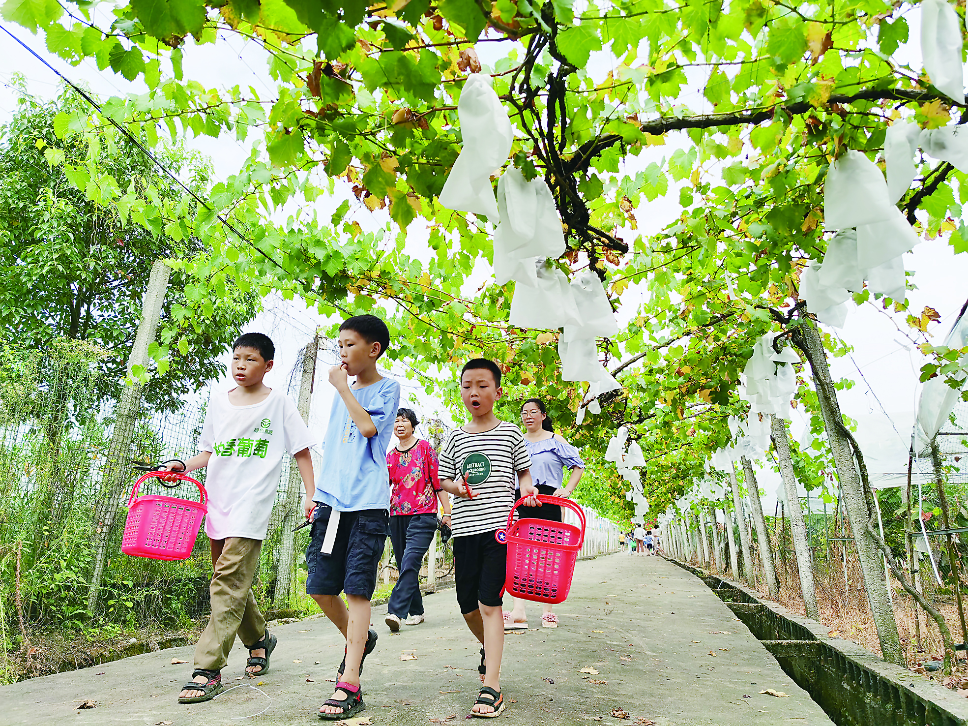 葡萄园内的观赏步道游人如织,水泥步道上方,青翠的葡萄藤和套袋的葡萄悬挂;步道两旁,葡萄栽种大棚整齐排列,棚内葡萄品种各异:“夏黑”颗粒饱满、“红宝石”甘甜爽口、“贵妃玫瑰”珠圆玉润……