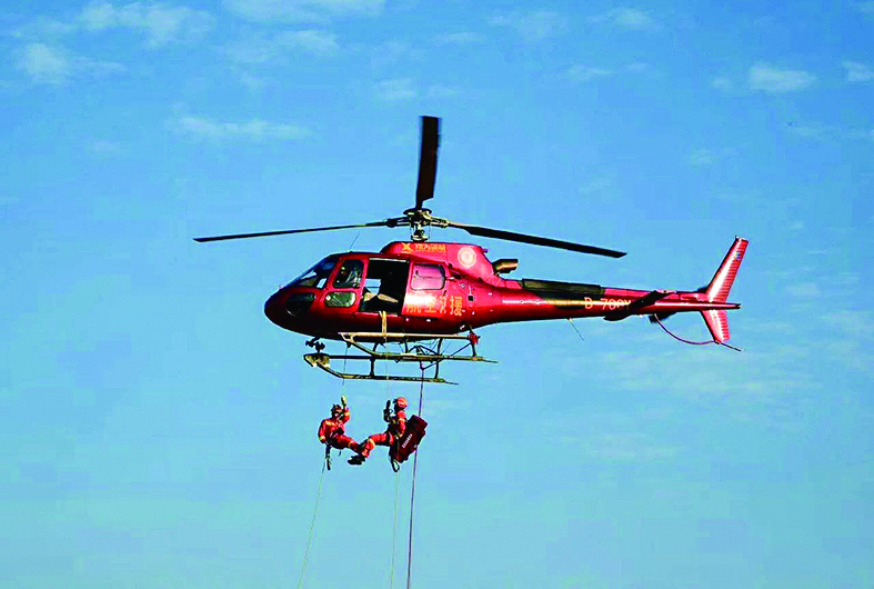 ◀航空救援大队队员在进行高空索降训练。