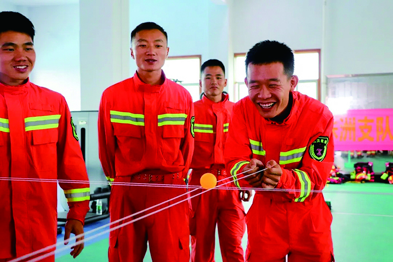 ▲紧张的训练后,消防员在享受趣味运动会带来的欢乐。