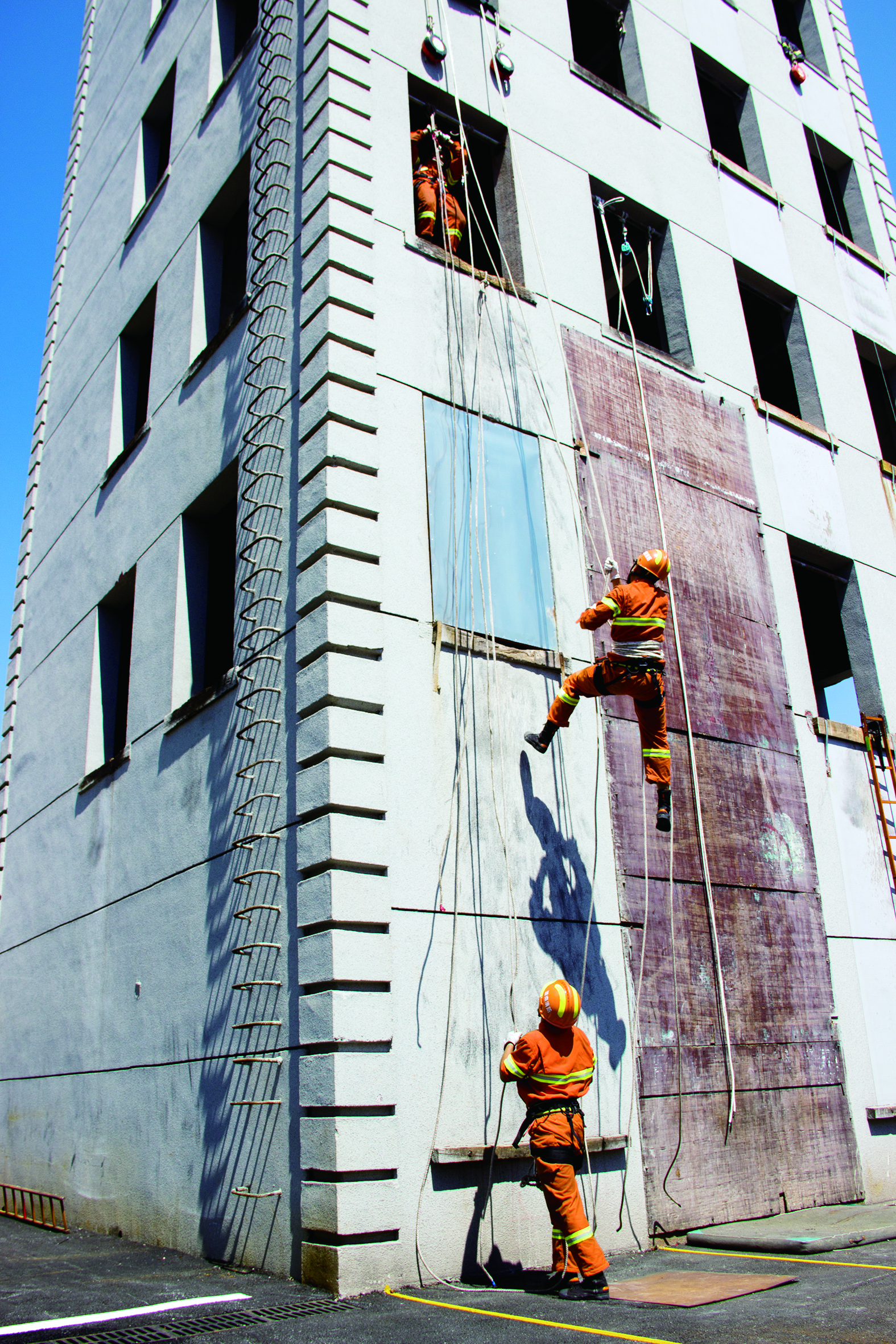 ▲消防员在进行绳索攀爬训练。
