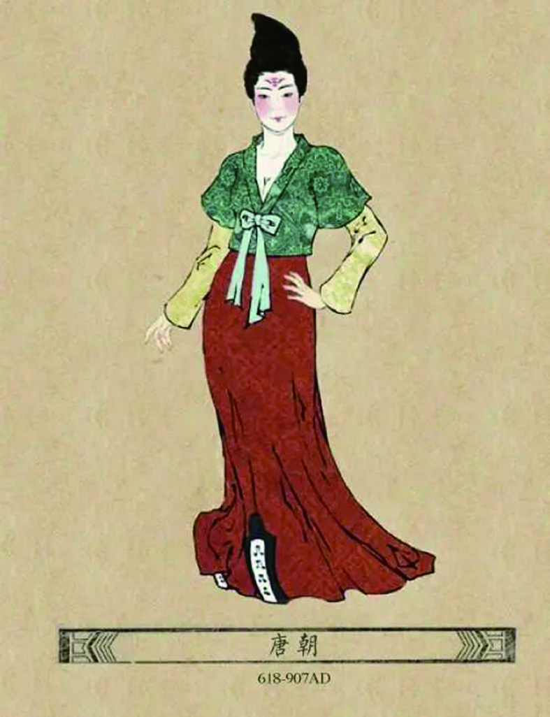 沈从文在《中国古代服饰研究》中写到:“半臂又称半袖,是从魏晋以来上襦发展而出的一种无领(或翻领)、对襟(或套头)短外衣,它的特征是袖长及肘,身长及腰。”在中国隋唐时期,半臂有对襟、套头、翻领或无领式样,袖长齐肘,身长及腰,以小带子当胸结住。因领口宽大,穿时袒露上胸。多穿在衫襦之外。流行于隋代宫廷内,先为宫中内官、女史所服,唐代传至民间,历久不衰。