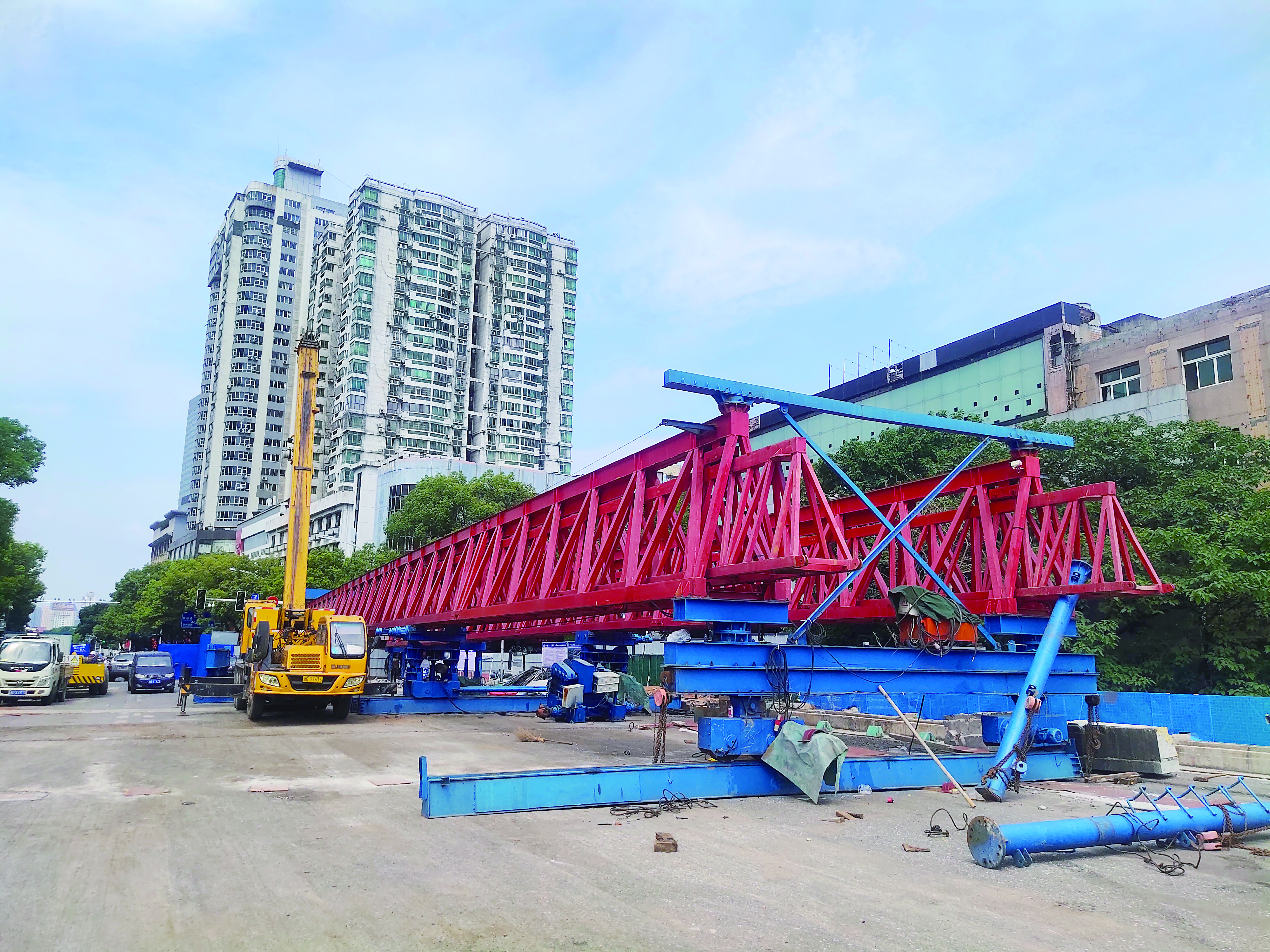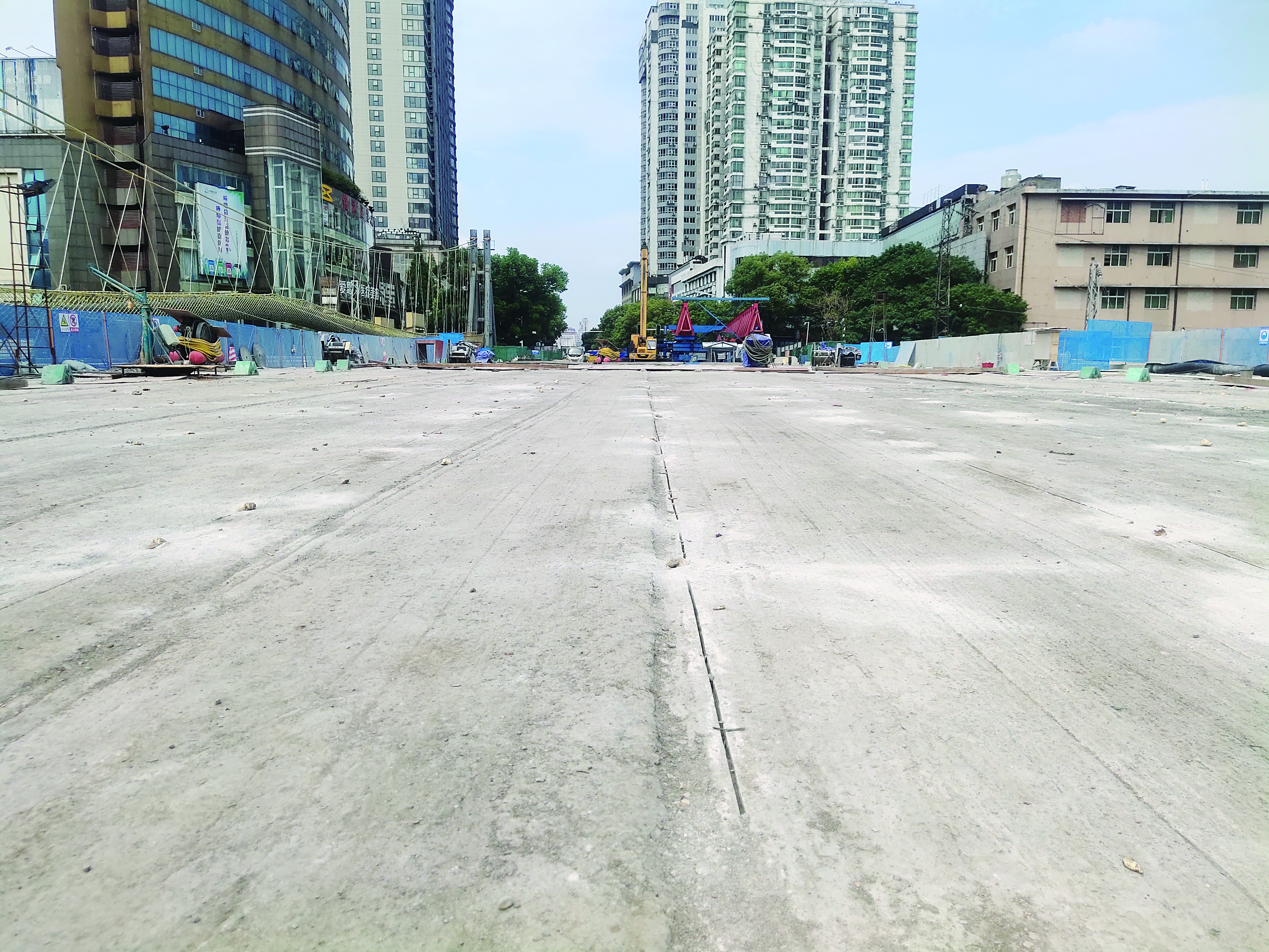 在新华桥西头,一台大型架桥机已经全部组装完毕;东头,另外一台架桥机的组装工作也正在进行中;桥面上,可见多条规则分布的切割线,部分位置已经打好孔洞。