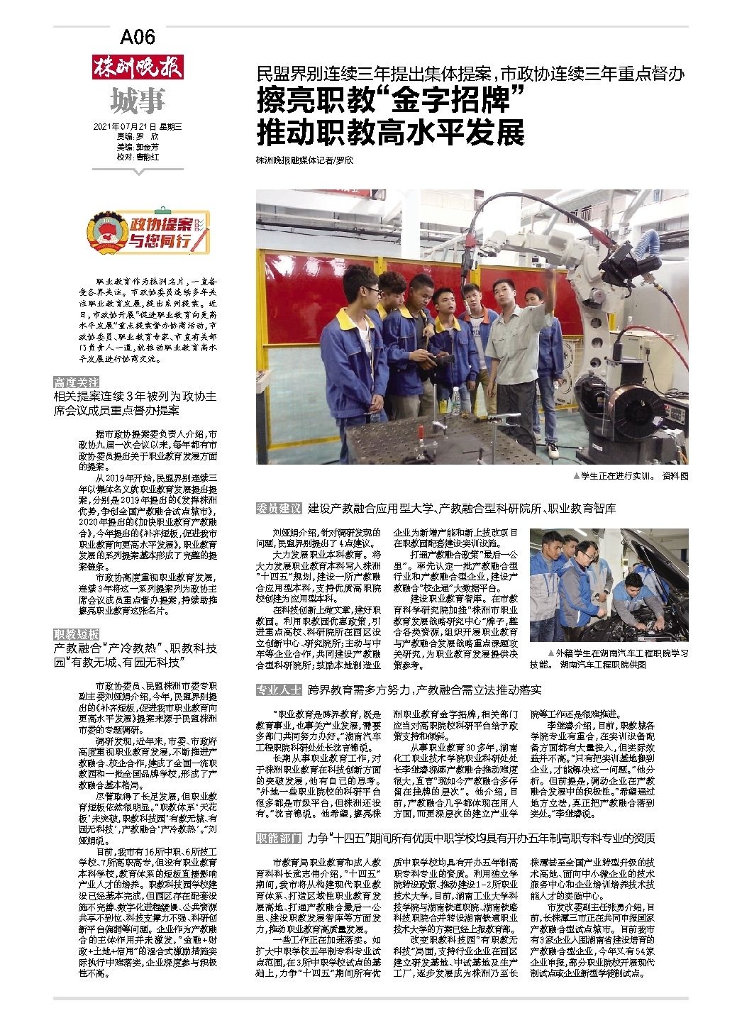 市政协高度重视职业教育发展,连续3年将这一系列提案列为政协主席会议成员重点督办提案,持续助推擦亮职业教育这张名片。