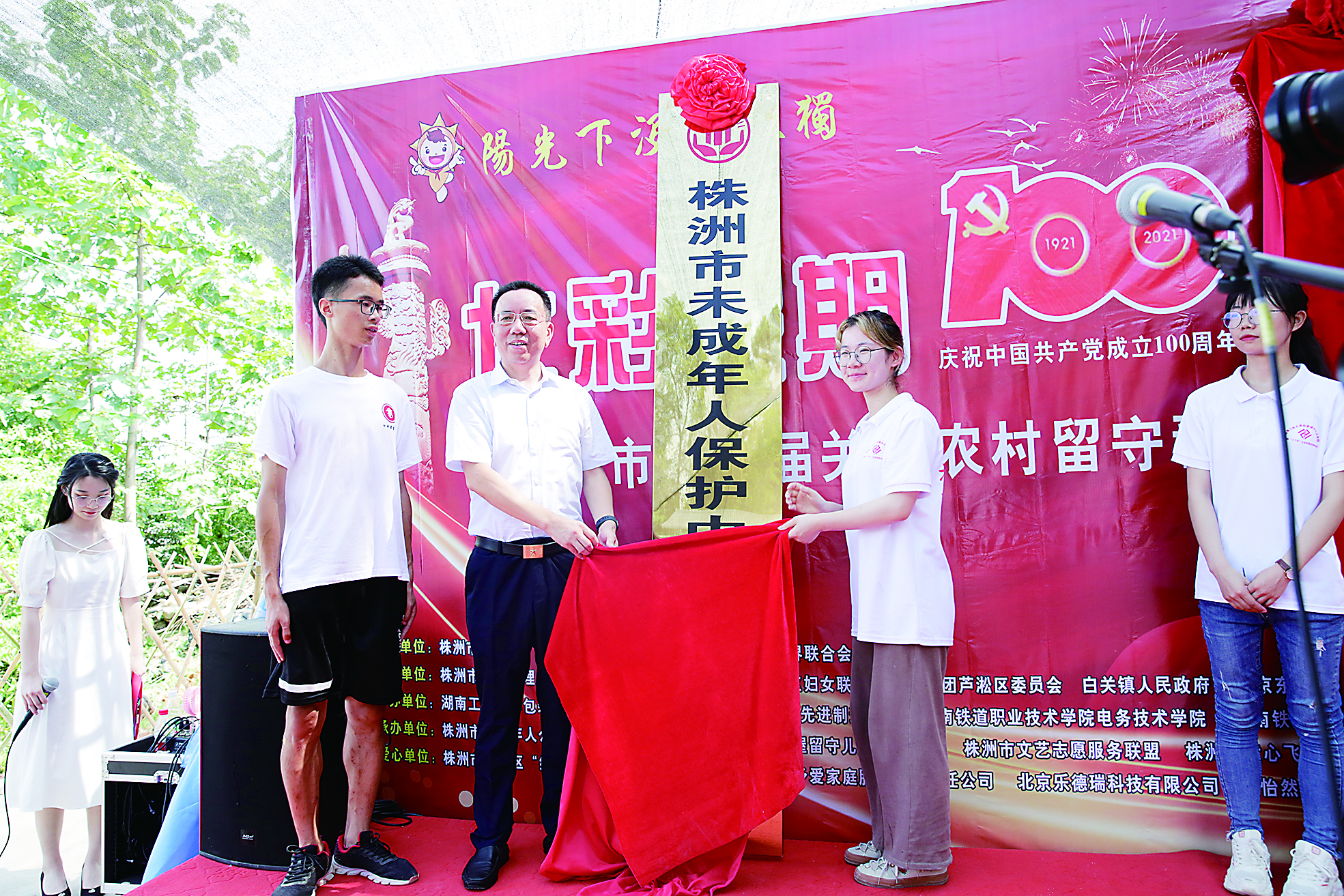 ▲株洲市未成年人保护中心社会实践基地揭牌暨“七彩假期·情暖童心”2021年株洲市第七届关爱农村留守青少年儿童公益夏令营开营。