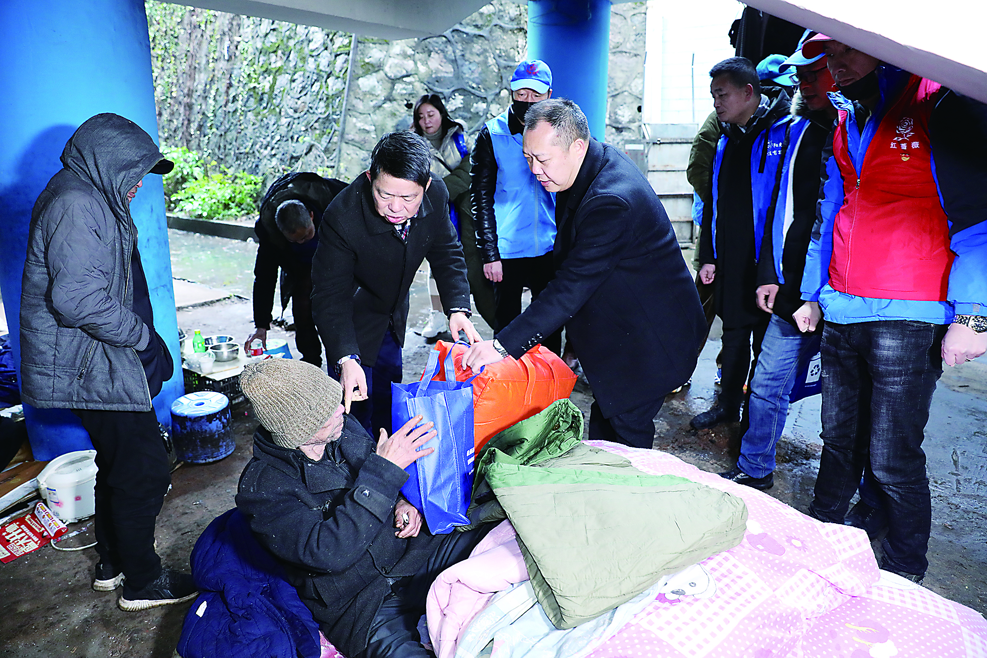 ▲市民政局党组成员、副局长卢仲良在四桥给流浪人员送温暖。