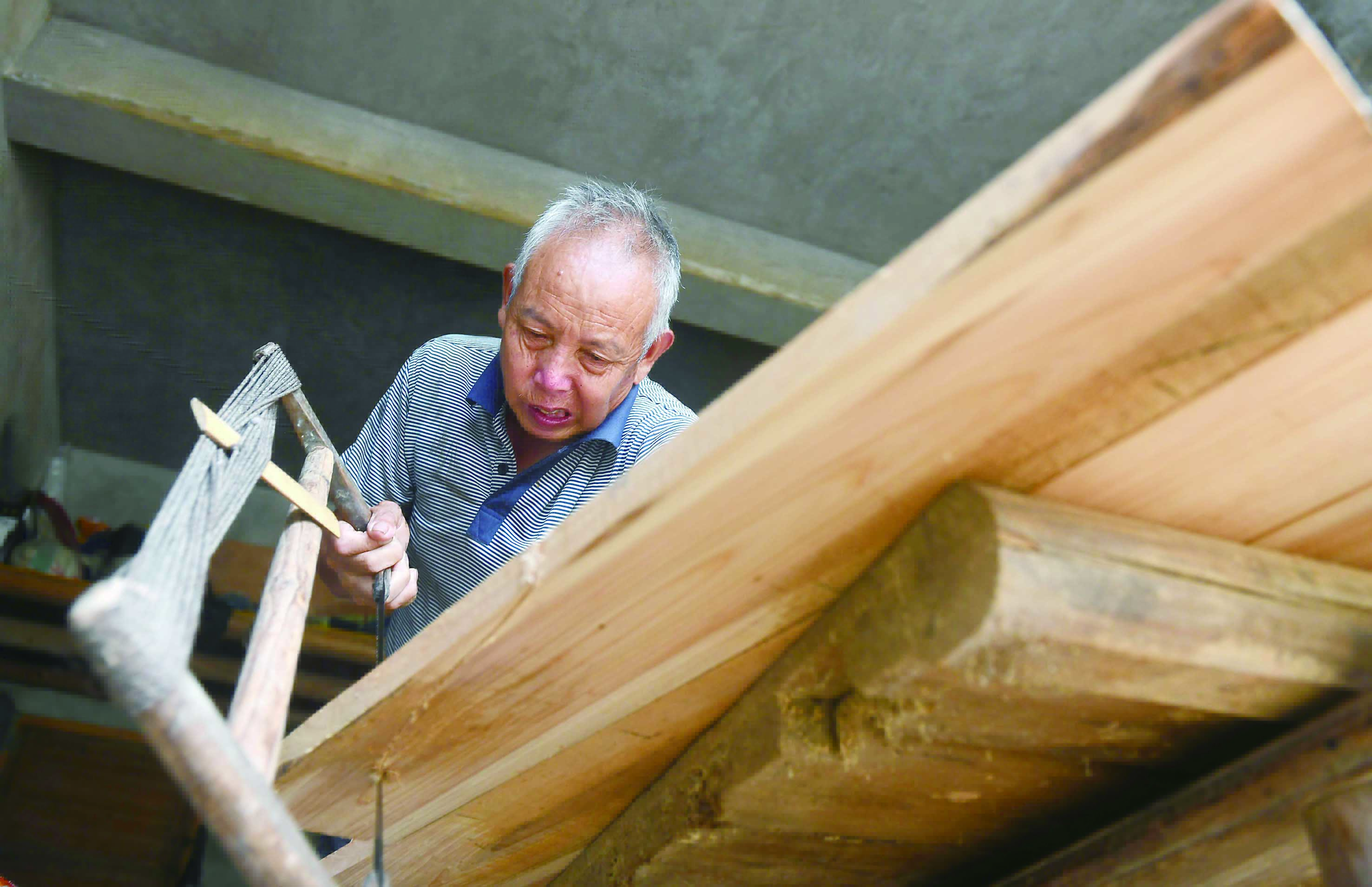 从14岁拿起斧锯,易利民一干就是56年。一双手满是老茧,握上去如砂纸般粗糙。这是56年来,他每天与木料、凿子、钻子、斧子打交道的印记。这双手十分灵巧,拉锯、推刨子、凿孔,曾经为乡邻盖房屋,打制生活用具、农具。